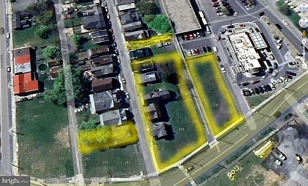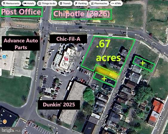 Take X 43 Maryland Ave > Park St to Williams Assembled properties - this is several adjoining vacant lots + derelict homes (between Chic Fil A and Elm St spanning the alley) + 2 other homes nearby not adjoining (604 Elm and 617 Elm)