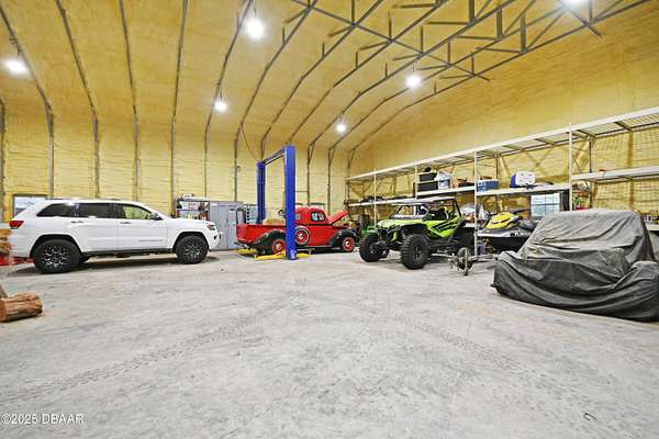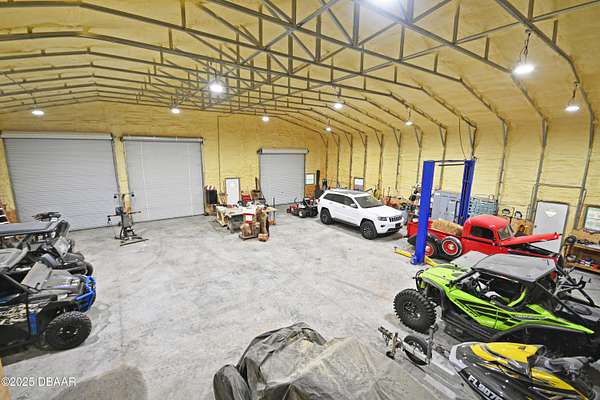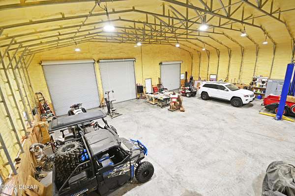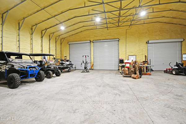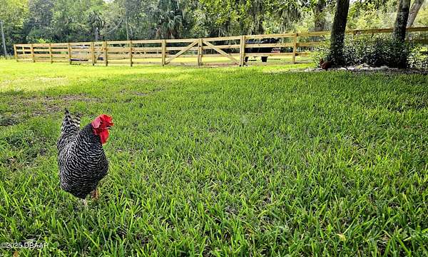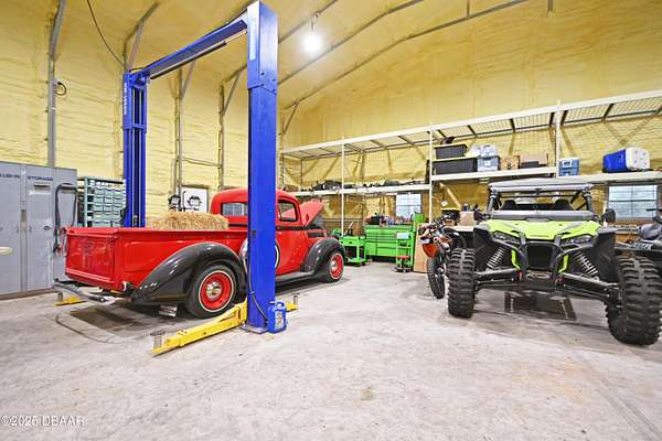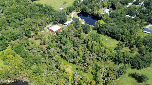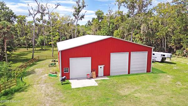 Looking for space, privacy, and freedom - all within minutes of the beach? This rare 5.7-acre ranch east of I-95 in New Smyrna Beach is the perfect blend of peaceful country living and unbeatable location. With four parcels sold together and agricultural zoning, this property offers endless possibilities for animal lovers, hobbyists, small business owners, or anyone craving wide-open space near the coast. There are two impressive buildings designed for versatility and function. The front building has a little bit of everything - a dedicated office, a cozy 1-bedroom apartment with shared kitchen and bath, a special dog grooming room, a large barn-style garage with loft, and a covered carport currently used for tractor and feed storage. There's even an air-conditioned dog house - because everyone deserves comfort here! The second building (built in 2022) is a dream workspace - 3,600 square feet with spray foam insulation, 16' high sidewalls, and three roll-up doors (two 14', one 12'). Outfitted with 110v and 220v outlets along every wall, it's ideal for large equipment, car projects, RV or boat storage, or any creative pursuit. Upstairs, there's a nearly finished office ready for your final touches, while downstairs offers an unfinished area perfect for a paint station or wood shop. Outdoors, the property truly shines. It's fully fenced and cross-fenced with both 4-board and wire fencing, multiple pastures with water and shade, and RV parking with 30-amp service. Enjoy gatherings by the small lake, complete with a floating dock, fountain, pavilion, covered patio, open seating area, and fire pit the ultimate spot to unwind and take in the Florida sunsets. Whether you're looking for a private retreat, equestrian setup, hobby farm, or place to run your business from home, this New Smyrna Beach property has it all space, flexibility, and an unbeatable location just minutes from the sand, shops, and dining. Only 1-mile to Tractor Supply, 2-miles to Publix, 3-miles to I-95 or Canal Street and 5-miles to Flagler Avenue and the beach! Come see this truly rare find you won't find another like it east of I-95 in New Smyrna Beach! All measurements are approximate.