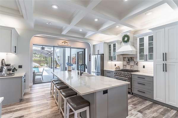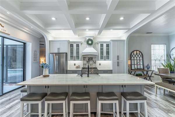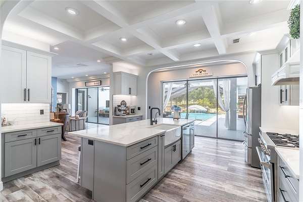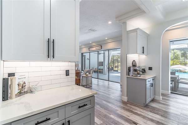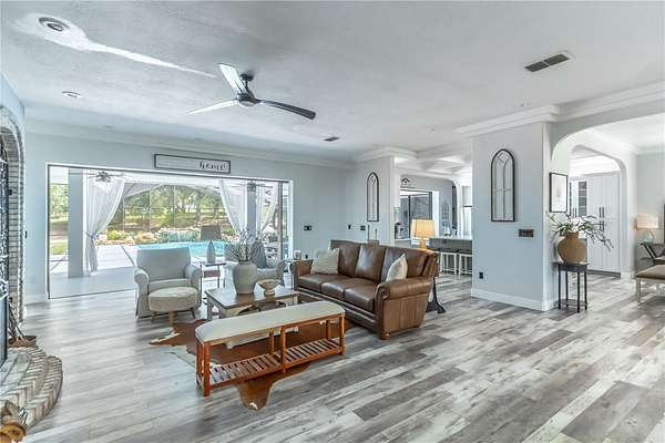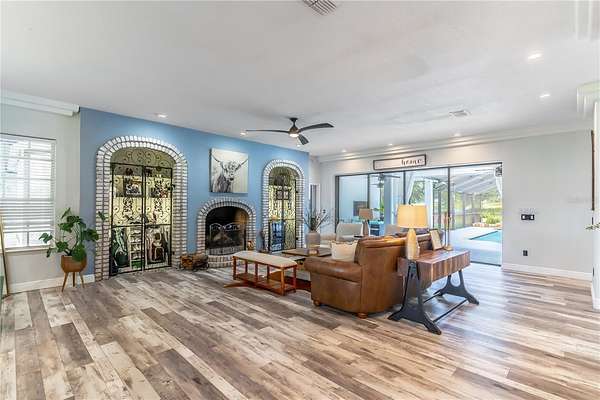 This open-concept home flows seamlessly into the living room, complete with a fully functional wood-burning fireplace, double sliding glass doors, and views of the pool and lanai area. Outside, you’ll find a 9-foot-deep saltwater pool with a rock water feature.