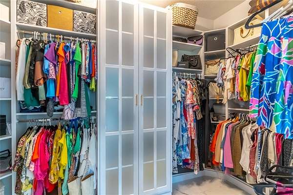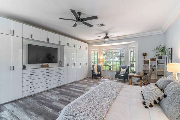 - Built-In Features, Ceiling Fans(s), Crown Molding, Eat-In Kitchen, Open Floorplan, Primary Bedroom Main Floor, Solid Surface Counters, Solid Wood Cabinets, Stone Counters, Walk-In Closet(s), Window Treatments