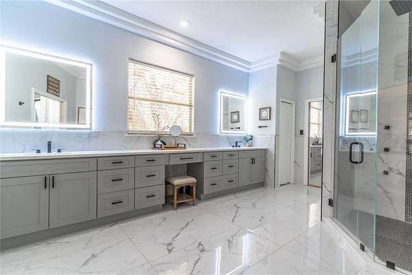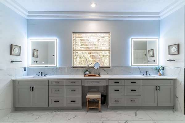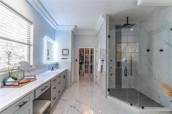 The primary suite offers true luxury, featuring built-in closets and a cozy sitting area. The ensuite bathroom is elegant, with double sinks, lighted mirrors, a walk-in shower with multiple shower heads, a private water closet, and a custom walk-in closet.
