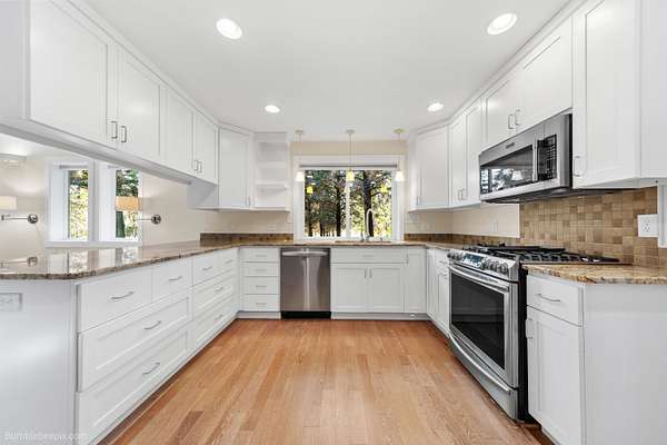 - Dishwasher, Free-Standing Range, Gas Range, Hard Surface Counters, Microwave, Refrigerator