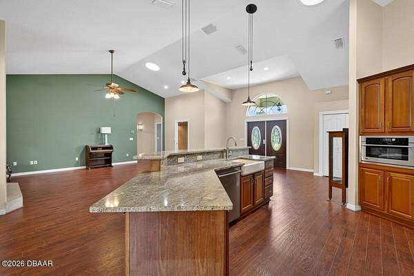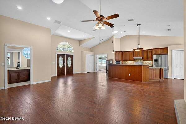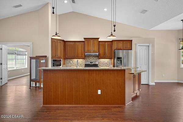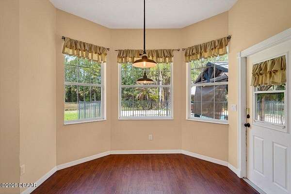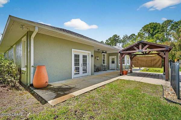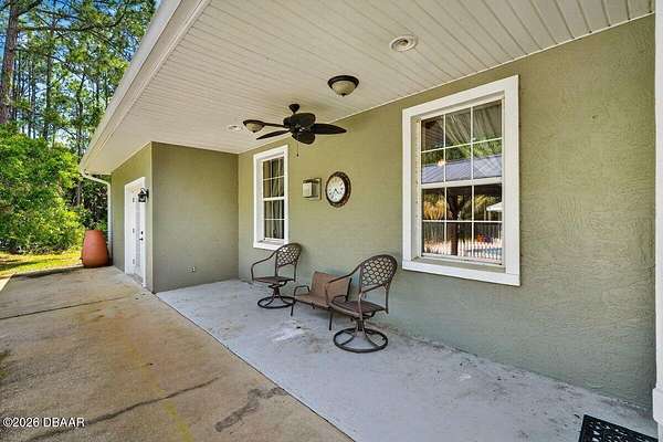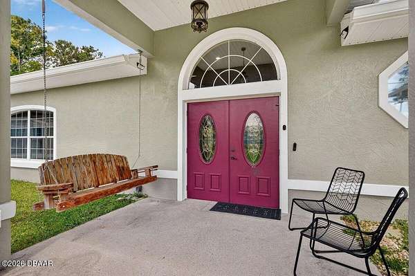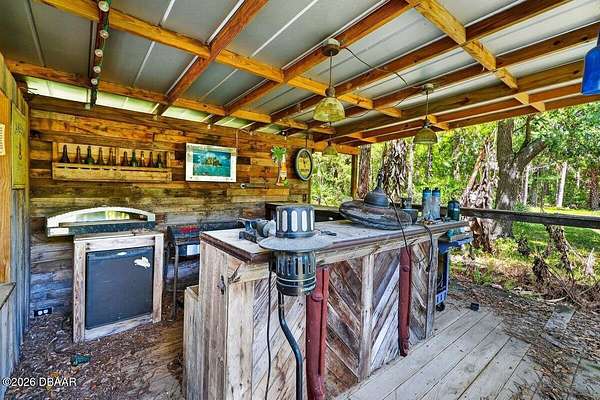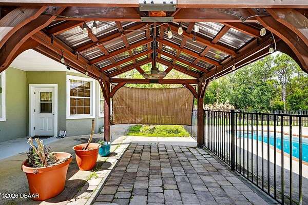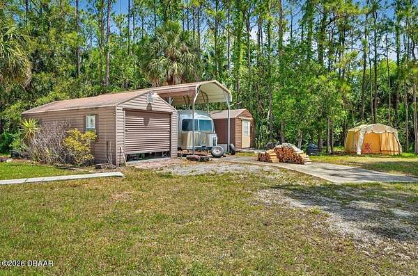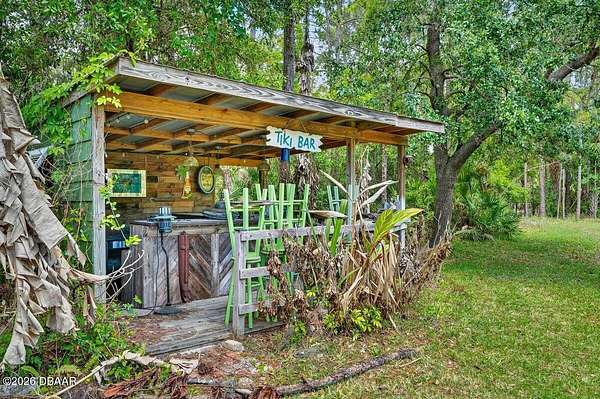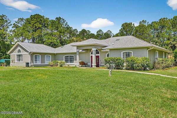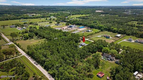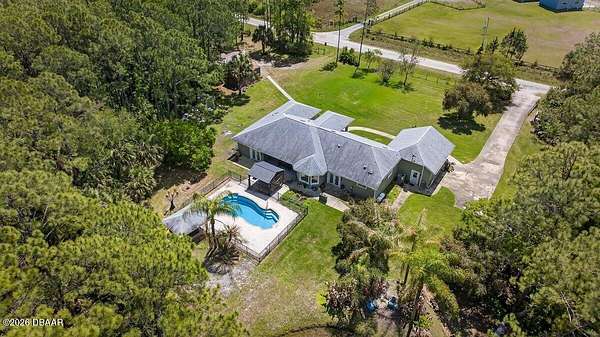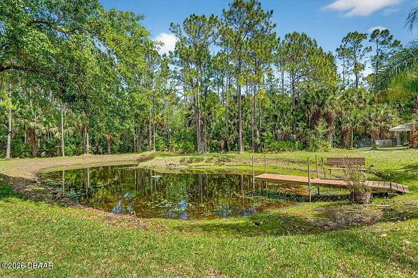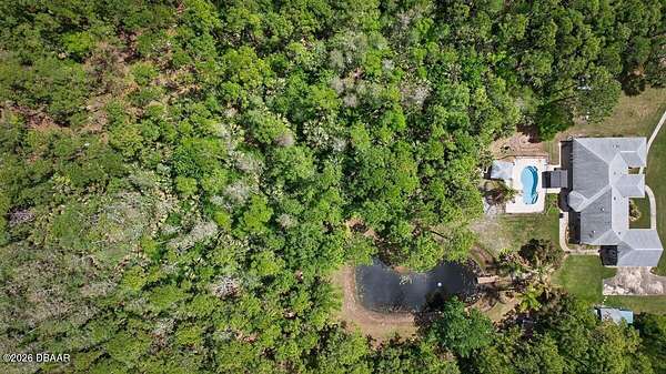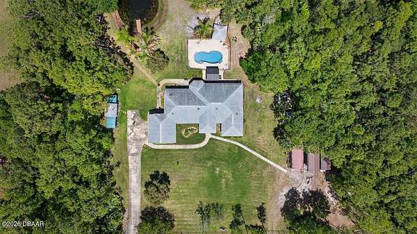 Tucked away on just over 5 private acres in the desirable Ormond Beach countryside, this beautifully maintained concrete block home built in 2002 offers the perfect blend of peaceful country living and convenient access to everything the area has to offer. Located just minutes from shopping, dining, and local attractions, 2312 Warden Trail provides the space, privacy, and versatility that are increasingly hard to find. The home features 3 oversized bedrooms, 3 full bathrooms, and a flex room that could easily serve as an office, game room, or potential 4th bedroom. One of the bathrooms has been thoughtfully modified for handicap accessibility, adding flexibility and convenience. Inside, you'll find an inviting open concept living, kitchen, and dining area highlighted by vaulted ceilings, a cozy fireplace, and French doors that open to the backyard patio, creating a seamless flow for indoor-outdoor living and entertaining. Step outside and experience a property designed for relaxation and recreation. Enjoy the private pond, take a dip in the pool, or unwind under the tiki bar while taking in the peaceful surroundings. The expansive grounds also feature multiple large storage sheds, ideal for equipment, hobbies, or workshop space. Practical upgrades provide peace of mind, including a new roof in 2021, AC replaced in 2024, and a well replaced approximately four years ago. With three gated access points and a rare layout where the property extends from Warden Trail all the way to Baja Trail, the possibilities here are endless--whether you're looking for space to spread out, room for additional structures, or simply the privacy of your own slice of Florida countryside. A unique opportunity to enjoy acreage, privacy, and convenience all in one property--this is the lifestyle many are searching for but rarely find so close to town.
