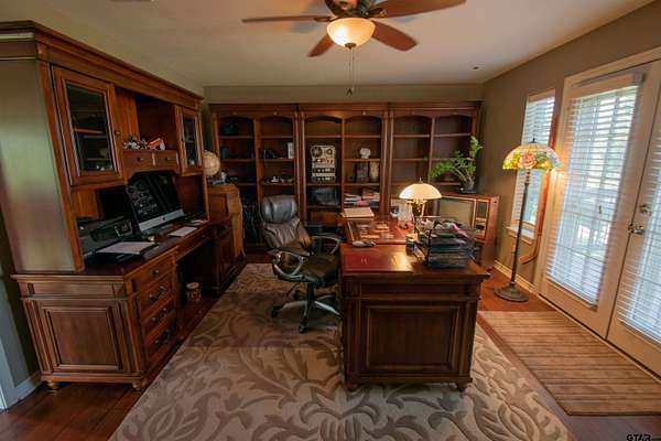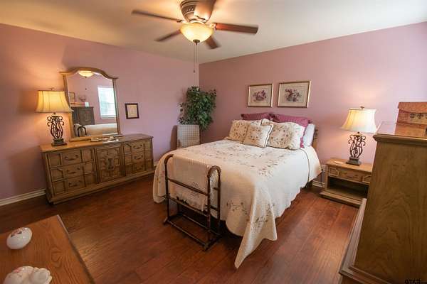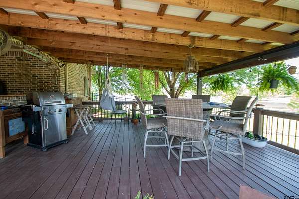 Immaculate & beautifully maintained, this lovely 5-bedroom, 2.5-bath home sits on 4.628 acres across 2 tracts w/approx. 400' of private lake frontage in the desirable Stallion Lake Ranch community/Van schools. Designed for both comfort & functionality, the home features German-engineered wood laminate flooring throughout, soaring ceilings & open-concept layout filled w/natural light. The kitchen is a chef's dream w/custom cabinetry, granite countertops, prep island w/sink, a second island bar w/cooktop & serving area, pantry & double ovens--one of which doubles as a microwave. All cabinet hardware/faucet fixtures have been updated to brushed nickel & all outlets have been replaced. The master suite offers a private covered deck & luxurious ensuite bath w/double vanities, soaking tub, separate shower & walk-in closet. The fifth bedroom, currently used as an office, opens to a private balcony w/sunset views & includes a wine closet, while a flex space off the entry adds versatility to the floor plan. The home is equipped w/2, 50-gallon water heaters, ensuring ample hot water for the entire household.The main house also features a 2-car garage w/tornado shelter.. An extended driveway leads to a remarkable 2,200 sq ft fully insulated shop w/12' overhangs on 2 sides/HVAC/fluorescent lighting/ceiling fans/a wall of cabinets/workbench/additional full bath/office/workshop area/carport/2 horse stalls--ideal for equestrian enthusiasts or potential conversion to a guest home. Both the home & shop feature new roofs installed 10/24. The property is fully fenced & can accommodate up to 3 horses/HOA guidelines. A dock could be installed on the lake & a pump could be added to water your property w/ HOA approval. SLR residents enjoy access to an equestrian center with paddocks & indoor stalls, as well as a fishing dock w/trolling motorboat access. Conveniently located between Lindale & Van/30 minutes from Tyler/1.5 hours from Dallas. Easy I20 access! Come See! Come Buy!
