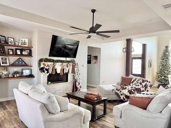 Est $3,851/moStunning Custom home built in 2024 on 10.94 acres!! High ceilings throughout with breakfast area and formal dining area with beautiful stained wood columns. Living room has a wood burning fireplace with wood shelves that can be removed for a Christmas tree. This house has plenty of natural light. Great size bedrooms and bathrooms that have big walk in showers. Recently installed pipe fencing on the property and roping arena, and a fenced area for animals. Don't miss out on this house!!