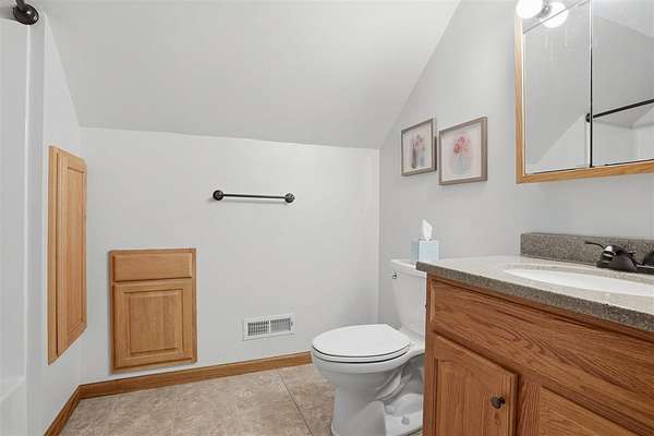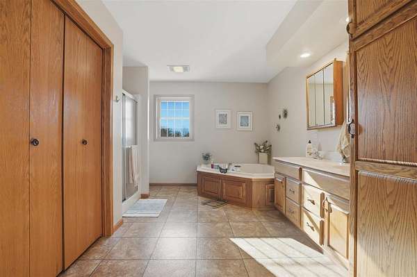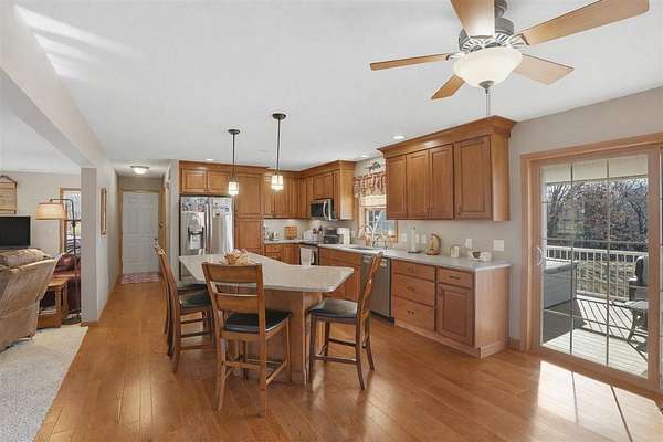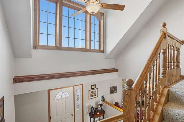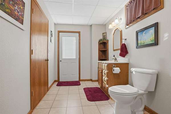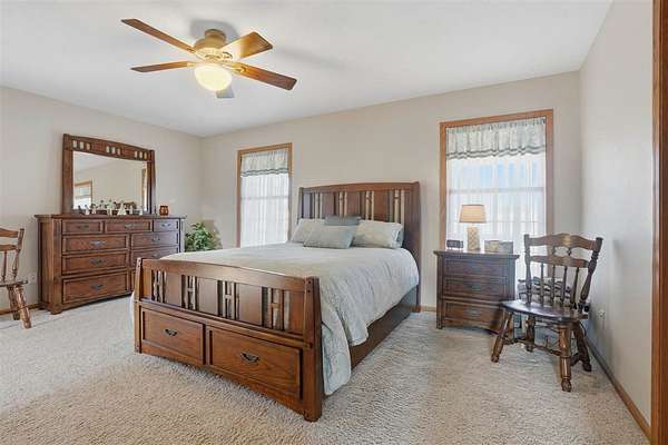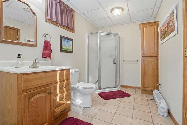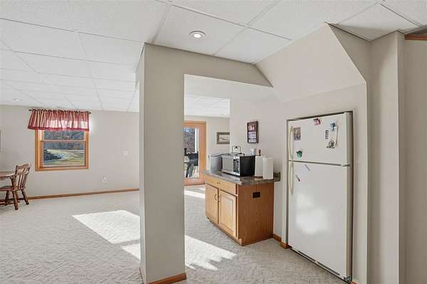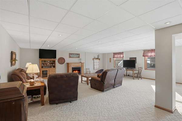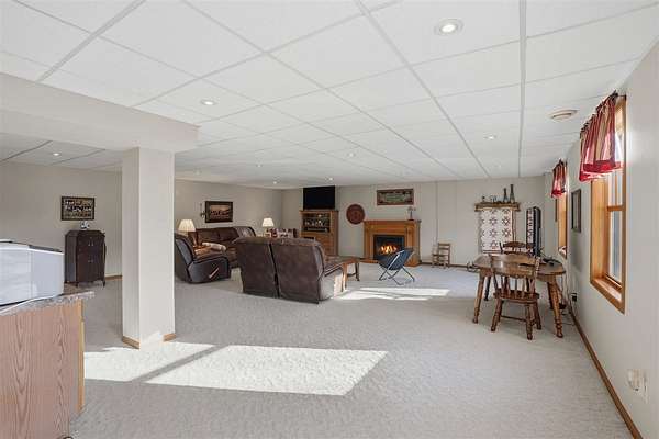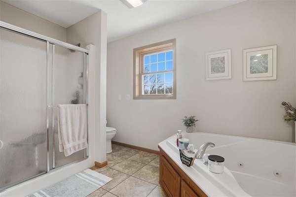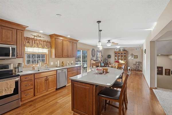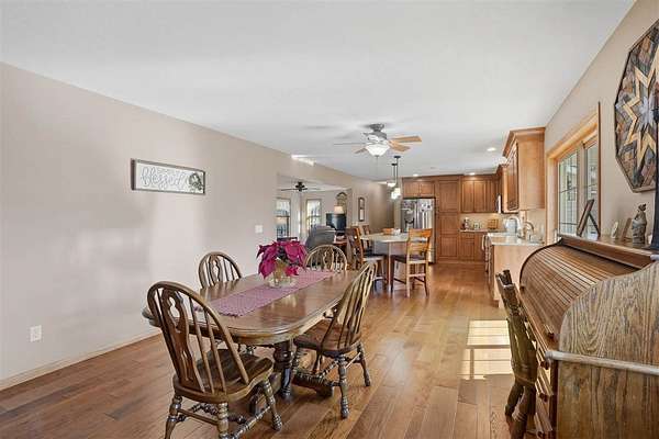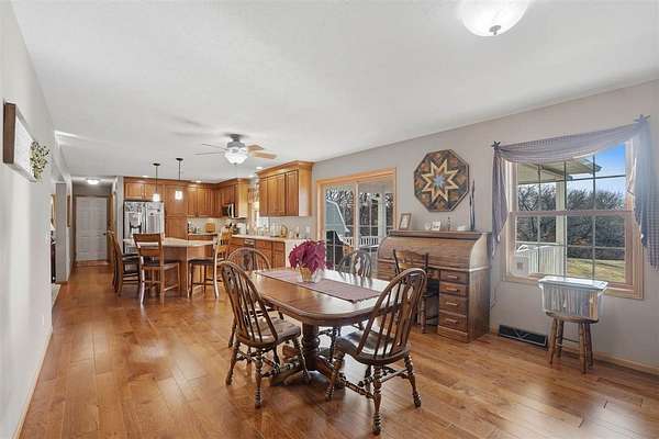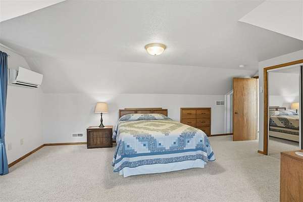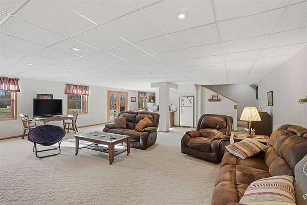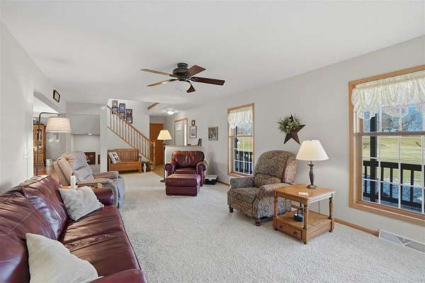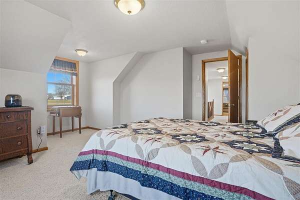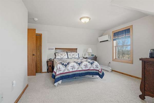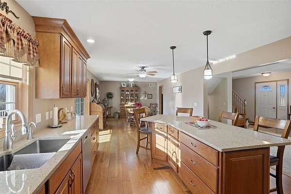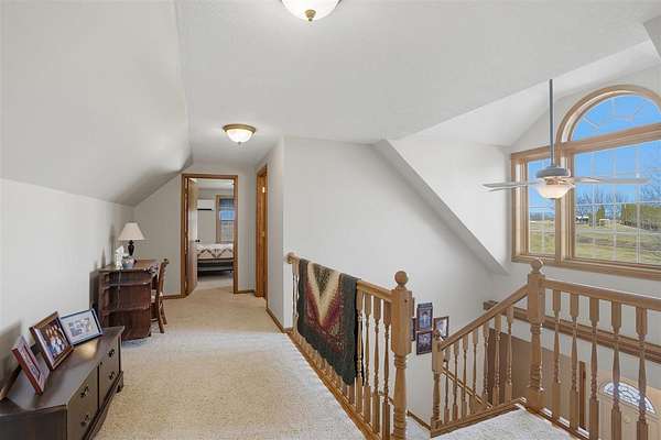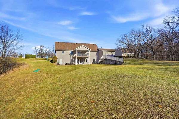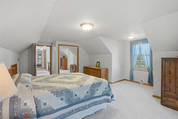 Well-maintained 1 1/2-story home on 7.74 acres offering a functional layout with quality finishes throughout. The welcoming entry opens to a bright main level featuring updated floors, neutral tones, and excellent natural light. The open kitchen, dining, and living area is ideal for everyday living and entertaining. The kitchen offers solid wood cabinetry, center island with seating, solid-surface countertops, and stainless appliances, with easy access to the dining area and rear deck overlooking the peaceful acreage. The primary bedroom is located on the main level and includes a private ensuite bath with dual vanity, walk-in shower, soaking tub, and ample storage. The upper level provides additional bedrooms with vaulted ceilings, large windows, and ductless mini-split systems for efficient comfort, along with a shared bathroom and open hallway overlooking the entry below. The finished walk-out lower level features a spacious family room with fireplace, multiple seating areas, and a dedicated office area, ideal for remote work or hobbies. Exterior highlights include a covered front porch, rear deck, patio, garden area, and shed, all surrounded by mature trees for privacy. Additional features include an attached 2-car garage, city water, private septic, and a quiet rural setting with convenient access to town.