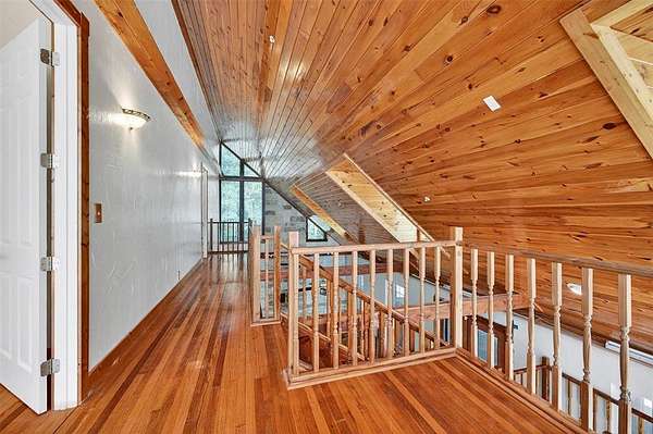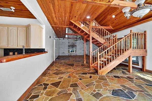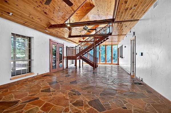 Inside, the open-concept layout is highlighted by soaring vaulted wood-plank ceilings, flagstone flooring in the main living areas, and solid hardwood floors in the bedrooms, kitchen, and upstairs living room. The gourmet kitchen features stainless steel appliances, a farmhouse sink, granite countertops, a spacious island with cooktop and vent hood, a large pantry, and abundant cabinet storage. Comfort and efficiency are top priorities, with a zoned geothermal heat pump system and a built-in fire suppression system for peace of mind.