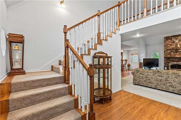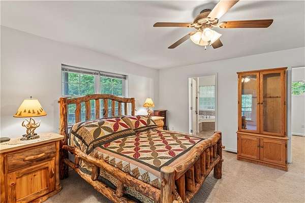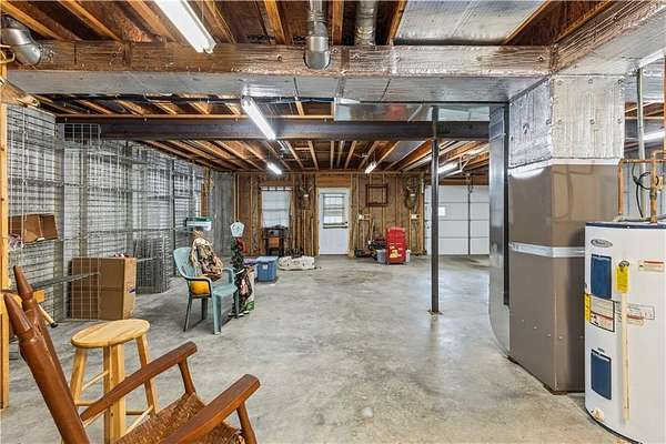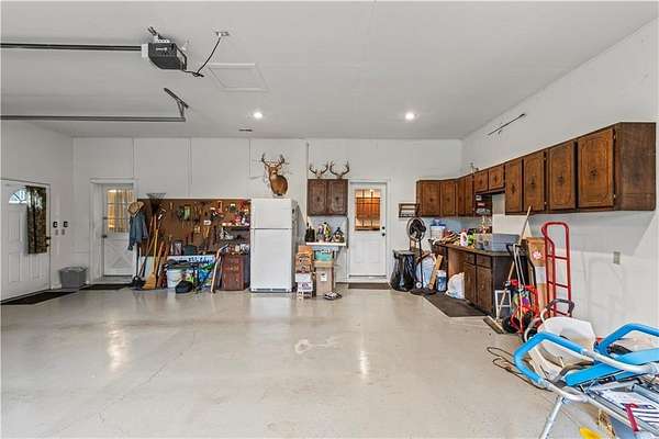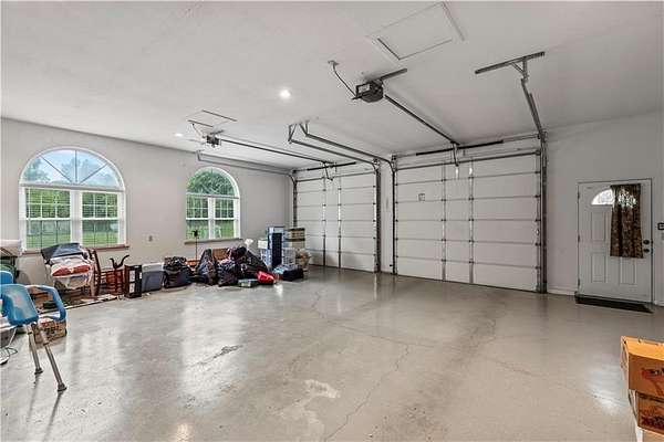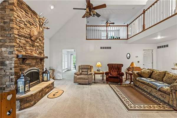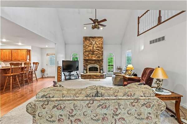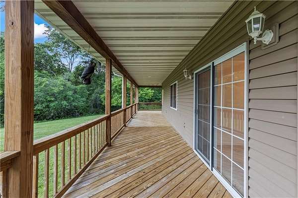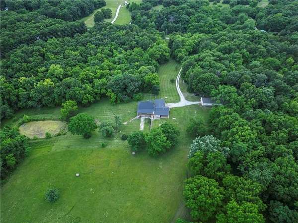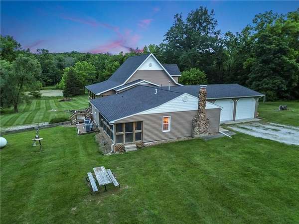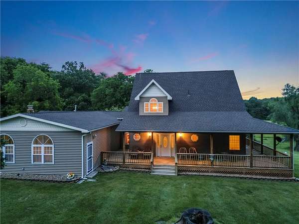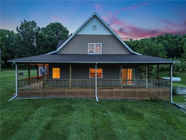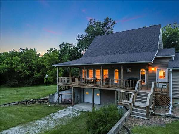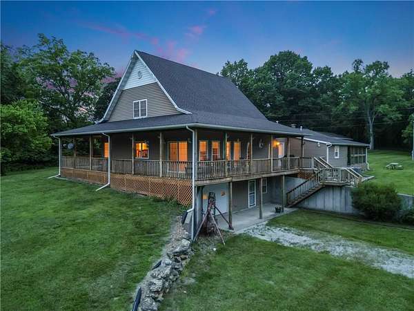 Sportman's paradise - welcome to 75 lush acres filled with wildlife, trails for hiking or riding UTVs/ATVs, and a stocked pond. This private retreat will excite any outdoor enthusiast. Wraparound porch showcases country living at its finest. Imagine the view with morning coffee and sunsets in the evenings. Inside the great room, a stunning stacked stone fireplace steals the show with soaring ceilings and a view of the loft. Loft makes a great office space or play area. Could also be easily converted to a bedroom that already has two closets and a bath. More space in the attic could be opened up and expanded as well. Primary suite is spacious with private bath with a shower and whirlpool tub. Two car garage on the main level and extra garage in the newer basement. So much storage! The serious hobbyist will appreciate setting up shop in the outbuilding with concrete floor and power. Older barn and chicken coop also on the property.