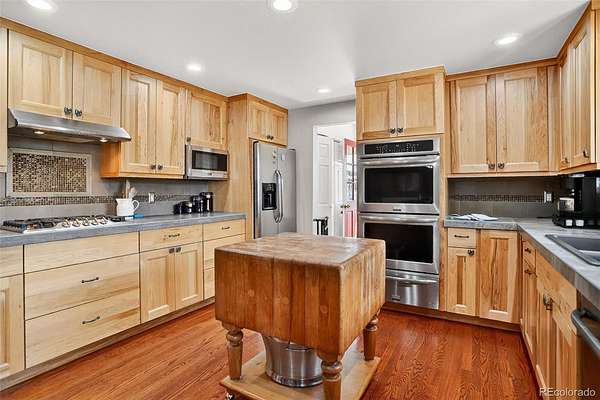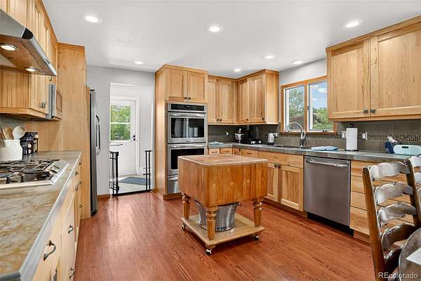Inside, you’ll find 5 bedrooms and 4 bathrooms, including a main-level primary suite with an updated bath, plus a second bedroom on the main floor. The updated kitchen boasts stainless steel appliances—gas cooktop, double ovens, warming drawer, microwave, dishwasher, and refrigerator—plus modern finishes perfect for the home chef. The family room’s wood-burning fireplace adds cozy charm, while the enclosed sunroom offers year-round enjoyment with views of the mountains.