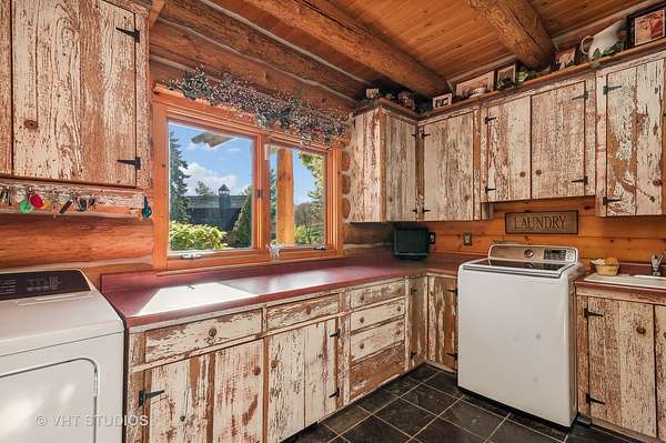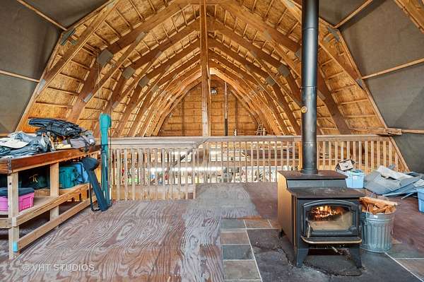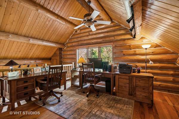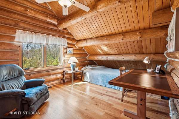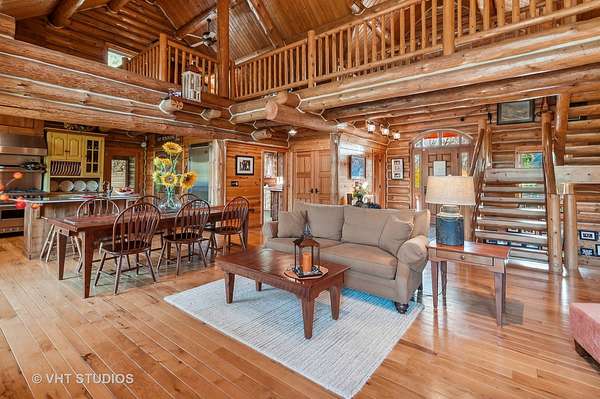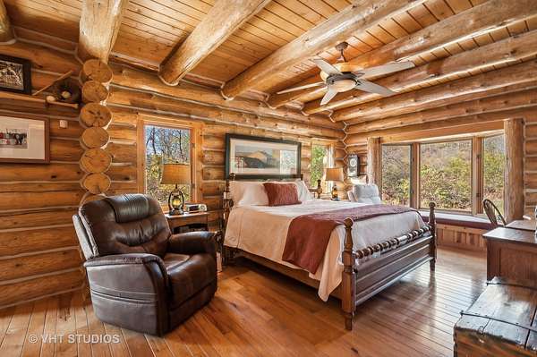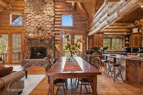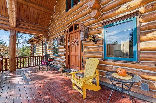 Detailed craftsmanship and thoughtfully curated ~ This 4-bedroom custom log home, featured in Log Home Living magazine, sits on 5 private acres and is the perfect country retreat! Nestled among the pines at the edge of the Brookdale Conservation area and just 5 miles from historic downtown Woodstock, this gorgeous gated estate property has it all. The inviting front porch opens to main floor living that includes hickory hardwood and slate flooring, soaring great room ceilings filled with natural sunlight, massive stone fireplace, gourmet kitchen with custom-built cabinetry, solid surface countertops, Viking appliances, 3 season room, huge mudroom with laundry, walk-in shower that could be converted into a dog wash and custom reclaimed barn wood cabinetry. The primary bedroom suite has a luxury bath with double sinks, enormous walk-in shower, and imported spa bath. The second floor features an open loft space for use as an office or den, 2nd guest bedroom, walk-in closet, and plumbing ready for a third full bath. The finished lower level provides more gathering space in the family room with fireplace, 3rd and 4th bedrooms, and full bath. Walk out to the lower private patio leading to the beautiful deck showcasing the expansive views and outdoor fireplace. The circular drive wraps around from the 2 car garage to the beautiful custom-built 30 x 77' barn with concrete floors ready for toys, animals, or use as a large-scale entertaining space. Make this natural sanctuary a place to escape and create new traditions!