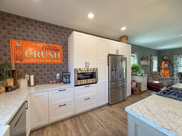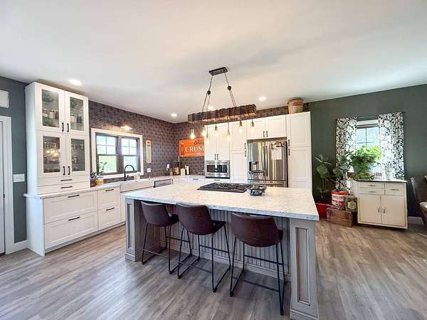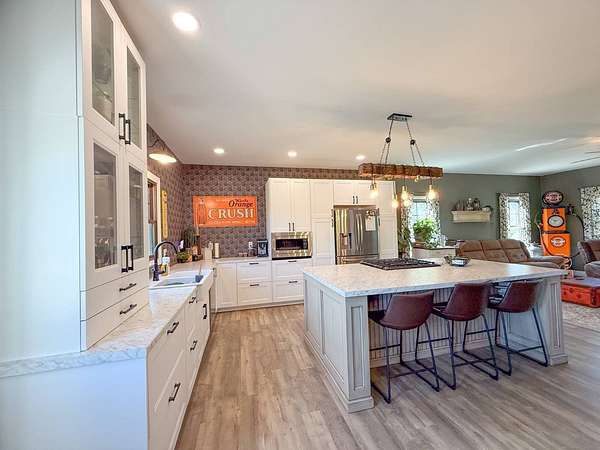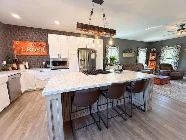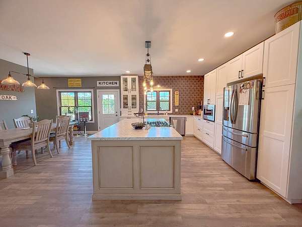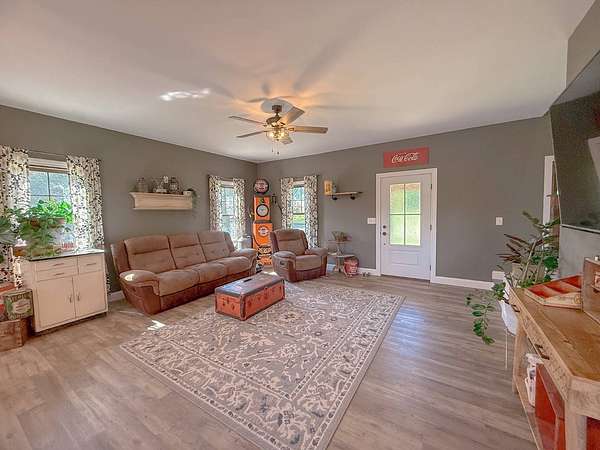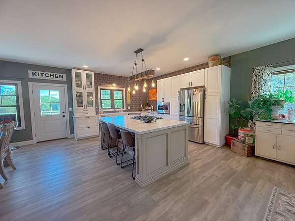 This 4 bedroom, 2.5 bath home sits on 5.75 acres and offers the perfect balance of privacy and convenience. Enjoy the quiet of the country with the convenience of town just around the corner. The main level offers an inviting open floor plan with modern finishes and plenty of natural light. The beautifully designed kitchen is the heart of the home, featuring a large island, custom cabinetry, and all appliances included. The washer and dryer also stay, along with bar stools, TVs, the master bed, boat, window coverings, and storage shed-making this property truly move-in ready. Built with spray foam insulation, the home is designed for comfort and efficiency. The garage/workshop under the house with walk-out access not only provides ample space for vehicles, projects, and storage, but also includes a convenient half bath. Outdoors, a large private pond is the centerpiece of the property-ideal for fishing, relaxing, or simply enjoying the view. The acreage provides room to roam, garden, or just soak in the peaceful surroundings. If you've been searching for a home that combines space, amenities, and a prime location just outside Pittsfield, this property is ready to welcome you.