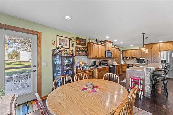 Welcome to this beautifully built, custom 4 bedroom, 2 1/2 bath ranch/reverse 1.5 story home nestled on 9 lush acres, perfect for a growing family and their animals. Constructed with attention to quality and detail, including 2x6 construction, Anderson windows, and cellulose insulation, this home boasts remarkably low utility costs (averaging only $167 per month for electric). A welcoming composite covered deck invites you into an open floor plan where the gourmet kitchen shines with custom cabinets, an island, granite countertops, stainless steel appliances, and a huge walk-in pantry. The cozy great room features a stone gas fireplace and opens to a wonderful screened-in porch, making it ideal for entertaining. The main level also holds a luxurious primary en-suite with a large, tiled shower, soaking tub, double sinks, and a generous walk-in closet, plus a convenient first floor laundry, mudroom, and half bath, all flowing over durable laminate floors. The finished lower level expands your living space with a large family room, a kitchenette, 3 additional spacious bedrooms, a full bathroom, and a truly unique feature: a secret room behind a bookcase perfect for securing a gun safe (which stays) and other precious items. Outside, you'll find a 3 car oversized attached garage, a 30x30 fully insulated outbuilding with electricity, concrete floor and a lean-to, a patio with a built-in stone firepit, and a fenced yard, all set within the 9 acres of timber, pasture, and hay, including 3 fenced areas--a fabulous area to raise your family.