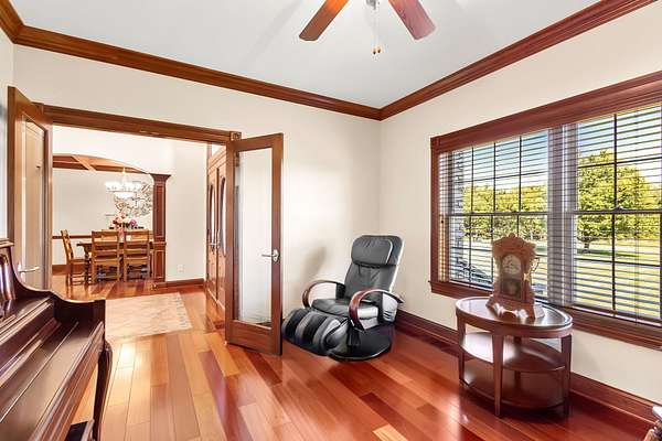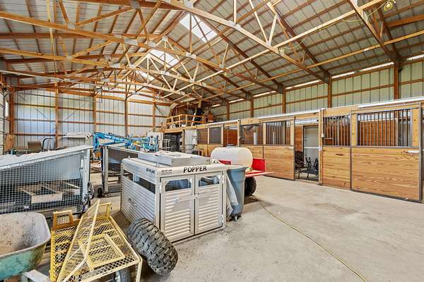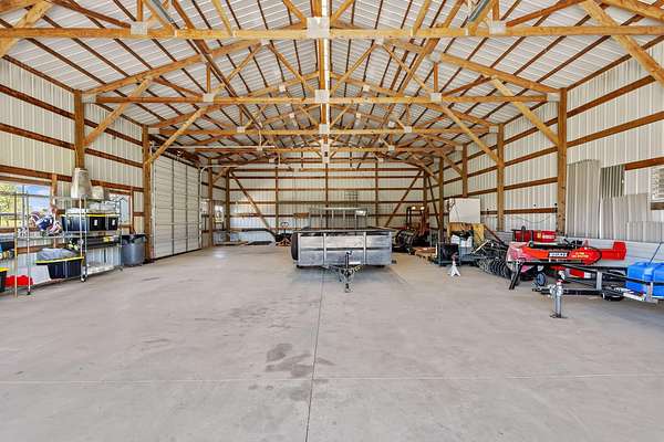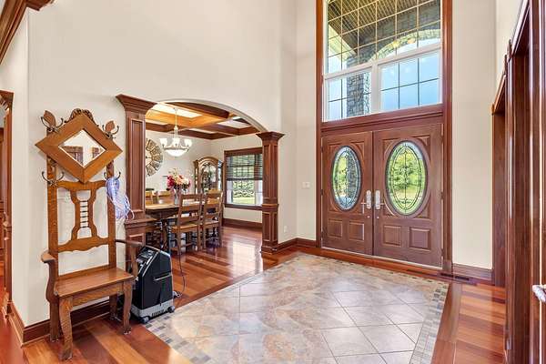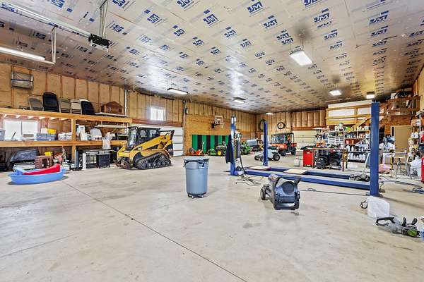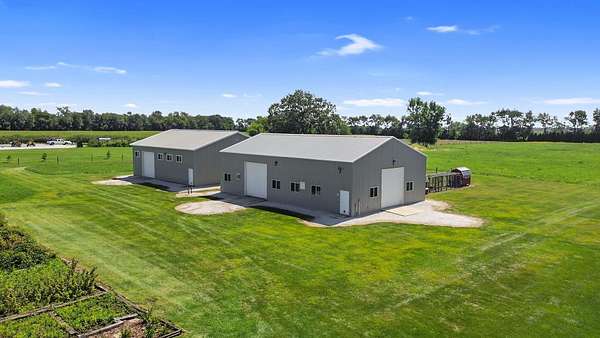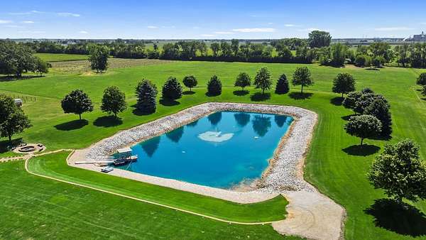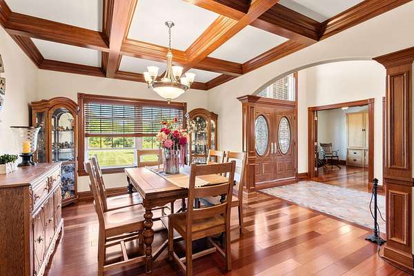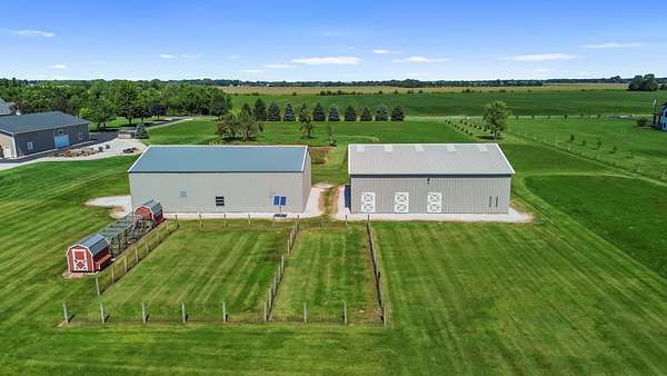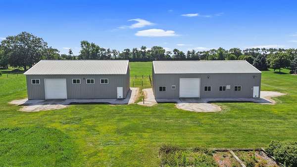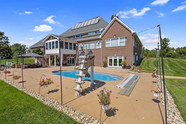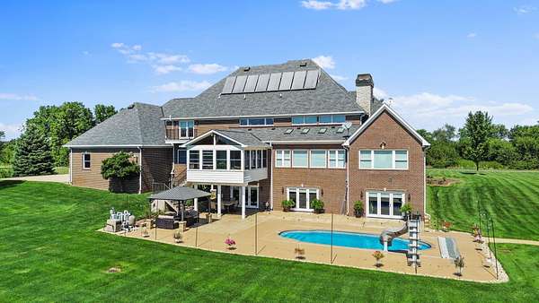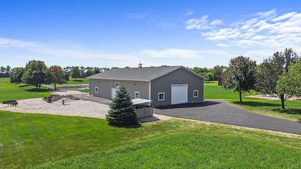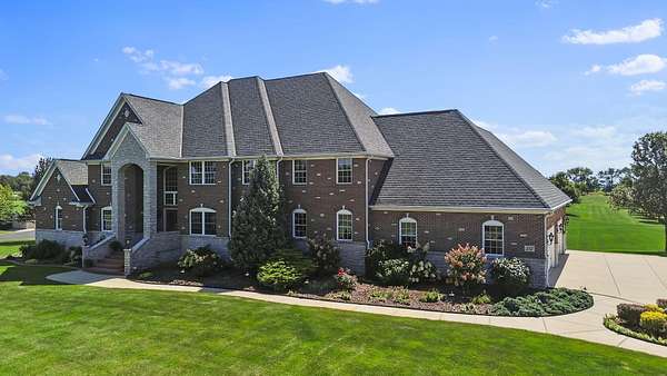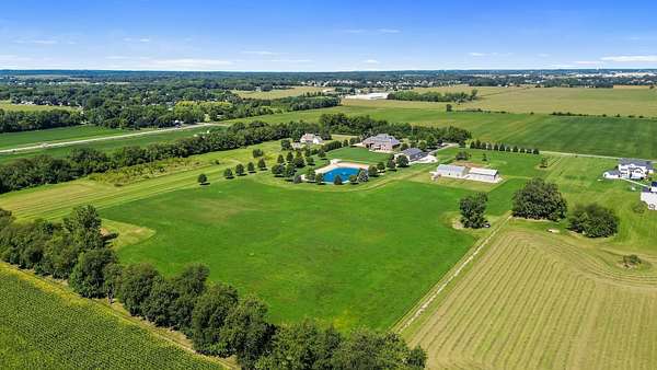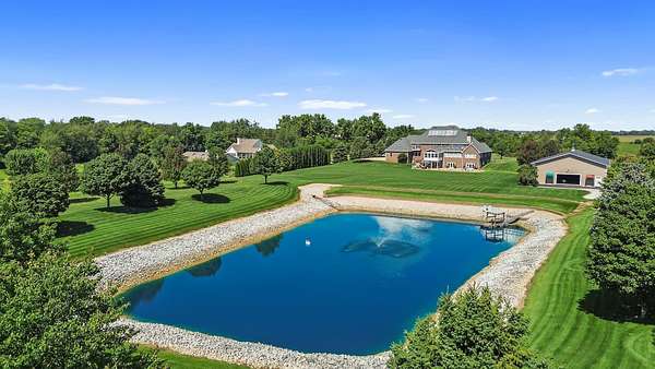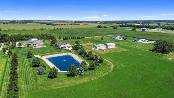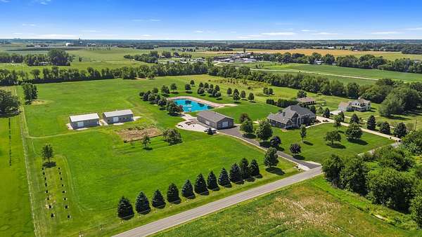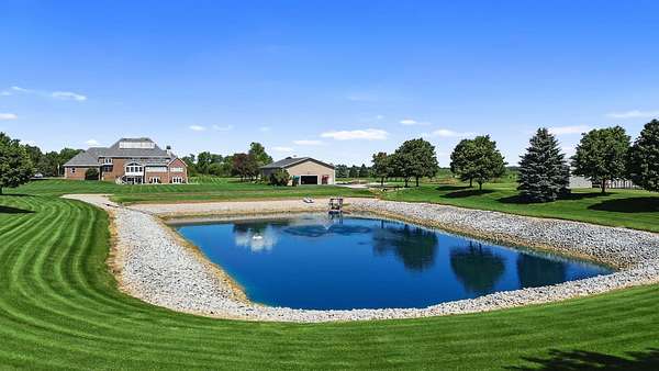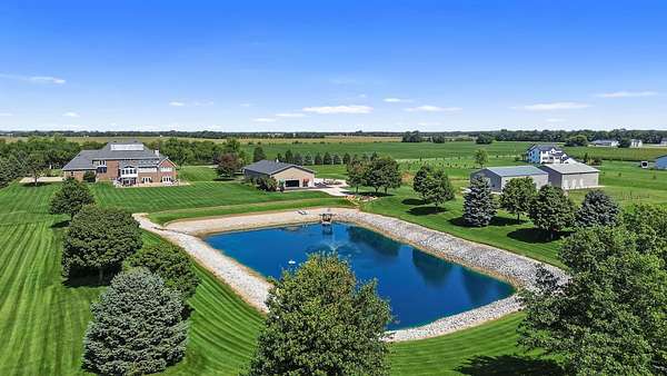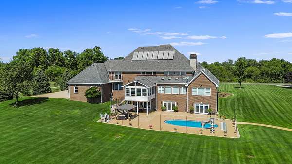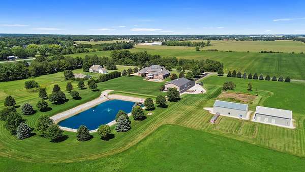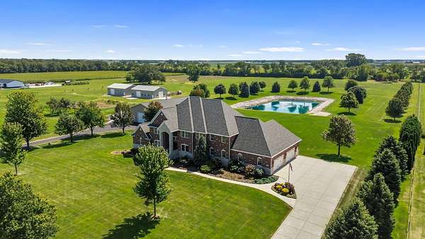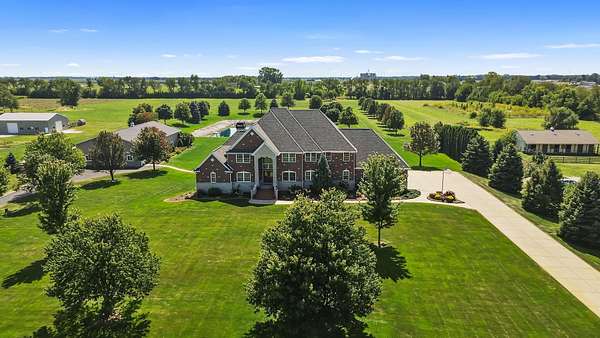 This distinguished brick residence offers over 8,000 square feet of finely finished living space set on 20 meticulously maintained acres. Designed for both elegance and everyday comfort, the home features 6 bedrooms, 5 bathrooms, and a thoughtful layout anchored by a main-floor primary suite with custom built-ins, a cozy fireplace, a private sitting area, and California Closets for organized luxury. A second main-floor suite provides the perfect arrangement for related living or extended guests.The main level is appointed with rich hardwood floors, an expansive living room with custom built-ins and a fireplace, a custom eat-in kitchen, and a bright sunroom complete with a built-in BBQ and ventilation system. Remote-controlled window shades, dual laundry rooms, and zoned heating and cooling add effortless convenience.The upper level offers four spacious bedrooms, a full bathroom, and views overlooking the main level. This floor also provides access to the attic, giving additional flexibility for storage or future expansion.The lower level walkout is an entertainer's retreat with a theater, game room, home offices, and an additional bathroom.Outdoors, the property shines with a heated 4-car extended garage, inground pool powered by solar panels, stocked pond, fruit tree orchard, and irrigated garden. Three versatile outbuildings include a main outbuilding with a car lift and controls for the property's irrigation system that covers approximately 8 acres of the property, Between two of the outbuildings you will find a solar powered well for watering animals. One outbuilding also offers three stalls--ideal for equestrian or hobby use.Practical upgrades such as a whole-house generator, 2019 roof with 50-year shingles, and full property irrigation ensure peace of mind.This estate blends refined living with functional amenities, offering a rare opportunity to own a private retreat just minutes from modern conveniences.