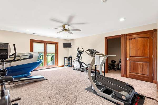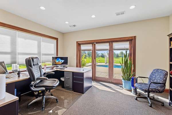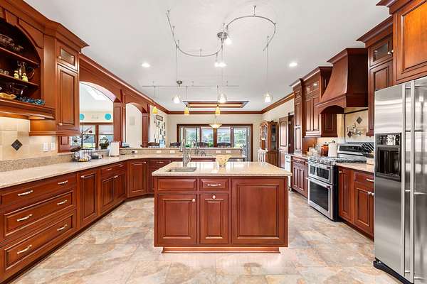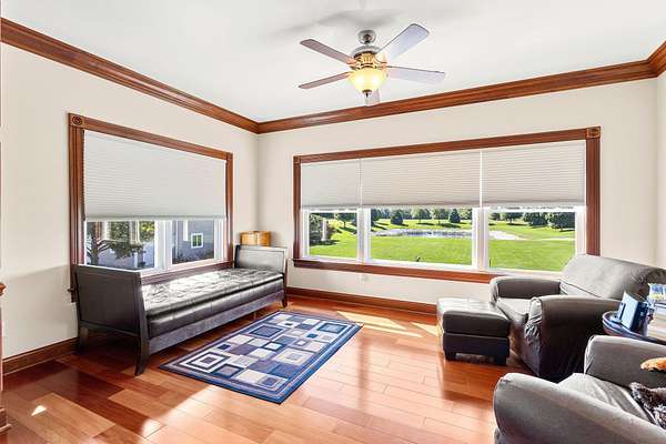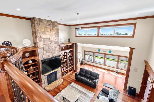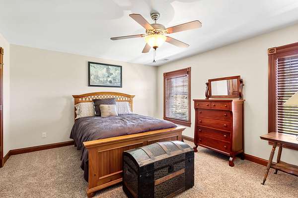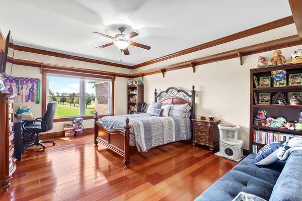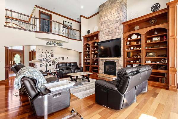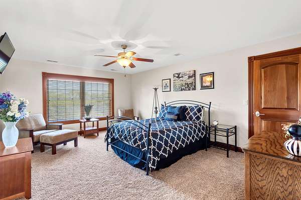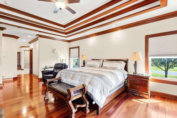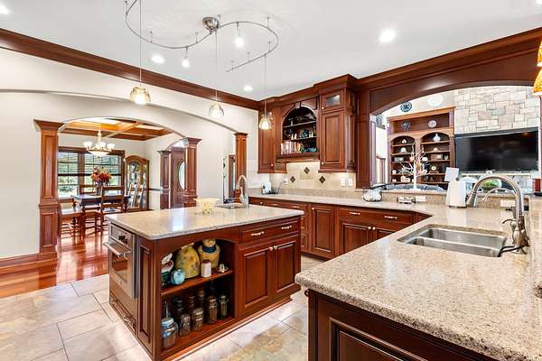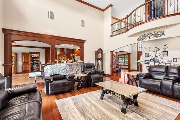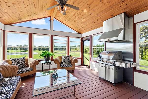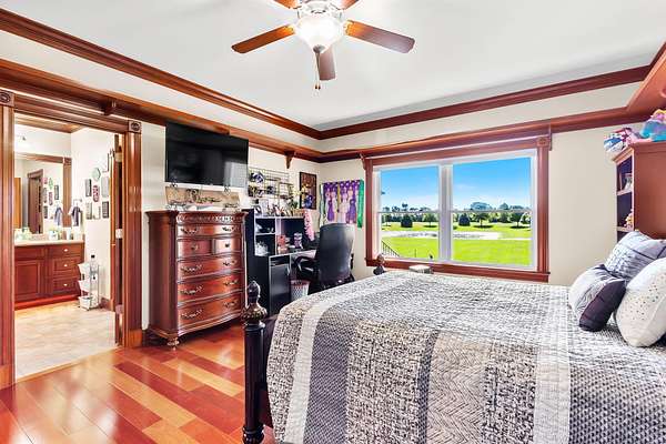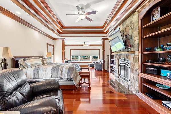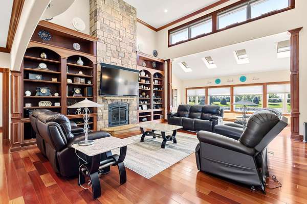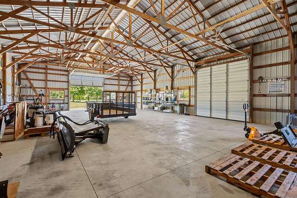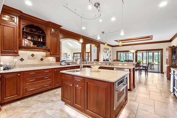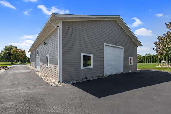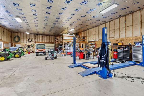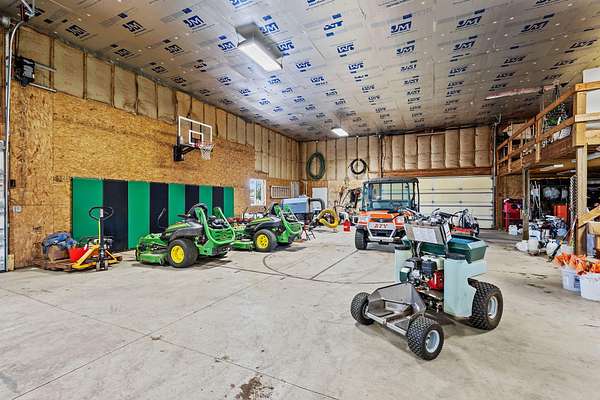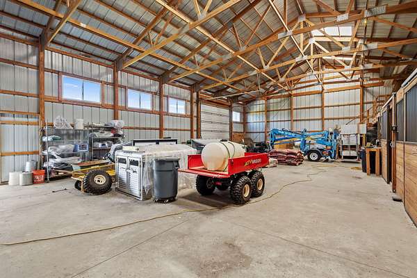 This distinguished brick residence offers over 8,000 square feet of finely finished living space set on 20 meticulously maintained acres. Designed for both elegance and everyday comfort, the home features 6 bedrooms, 5 bathrooms, and a thoughtful layout anchored by a main-floor primary suite with custom built-ins, a cozy fireplace, a private sitting area, and California Closets for organized luxury. A second main-floor suite provides the perfect arrangement for related living or extended guests.The main level is appointed with rich hardwood floors, an expansive living room with custom built-ins and a fireplace, a custom eat-in kitchen, and a bright sunroom complete with a built-in BBQ and ventilation system. Remote-controlled window shades, dual laundry rooms, and zoned heating and cooling add effortless convenience.The upper level offers four spacious bedrooms, a full bathroom, and views overlooking the main level. This floor also provides access to the attic, giving additional flexibility for storage or future expansion.The lower level walkout is an entertainer's retreat with a theater, game room, home offices, and an additional bathroom.Outdoors, the property shines with a heated 4-car extended garage, inground pool powered by solar panels, stocked pond, fruit tree orchard, and irrigated garden. Three versatile outbuildings include a main outbuilding with a car lift and controls for the property's irrigation system that covers approximately 8 acres of the property, Between two of the outbuildings you will find a solar powered well for watering animals. One outbuilding also offers three stalls--ideal for equestrian or hobby use.Practical upgrades such as a whole-house generator, 2019 roof with 50-year shingles, and full property irrigation ensure peace of mind.This estate blends refined living with functional amenities, offering a rare opportunity to own a private retreat just minutes from modern conveniences.