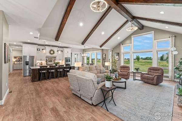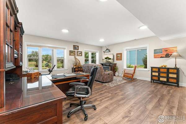 Experience luxury, space, and stunning mountain views in this breathtaking 6-bedroom, 5-bath custom ranch on 3.1 acres! Just 8.5 miles from Longmont, 18 from Boulder, 31 from DIA, and with quick I-25 access, the property is surrounded by farms and a permanent conservation easement, offering peace and privacy. The gourmet kitchen features custom cabinetry, quartz counters, abundant storage, and opens to a vaulted, wood-beamed great room with a cozy fireplace and walls of windows showcasing the views. The primary suite includes a private fireplace, deck, and spa-like bath with freestanding tub, dual sinks, and large shower. A dedicated main-level office and guest suite with en suite bath provide convenience and comfort. The spacious walk-out basement offers a wet bar, family room with fireplace, and three versatile bedrooms for guests, hobbies, or fitness. A large bedroom with en suite bath is ideal for multi-generational living. Car enthusiasts and RV owners will love the insulated 6-car tandem garage with hot and cold water spigot located in the attached garage ideal for washing vehicles, cleaning equipment, or other utility needs. RV and toy owners will appreciate the massive, insulated RV garage with 13-ft doors. This southwest-facing walkout home is built on concrete piers with steel beams and insulated concrete forms. It has a whole-house recirculation system that provides near-instant hot water to every sink, tub, and shower. You can be confident with the new Class 4 impact-resistant roof and transferable warranty. The professionally designed Xeriscape features native grasses and plants with efficient drip irrigation, highlighted by LED landscape lighting that sets the mood for enjoying the covered patio and outdoor fireplace-perfect for Colorado evenings.Each floor features its own dedicated furnace and A/C unit for efficient, customizable climate control.