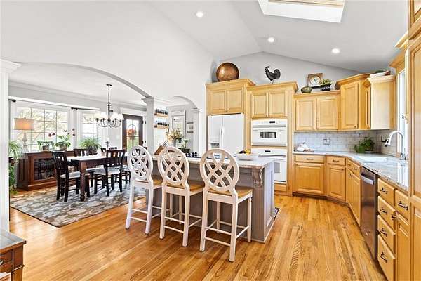 Experience the perfect blend of country charm and modern comfort on this 15+ acre estate, ideally located just off blacktop east of 291 Hwy South. The beautifully updated ranch-style home features light-filled living spaces, vaulted ceilings, and a cozy brick fireplace that creates a warm and inviting atmosphere. The open kitchen showcases granite countertops, natural wood cabinetry, stainless steel appliances, and a breakfast island with views of the scenic acreage beyond.