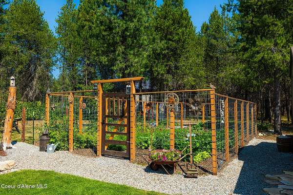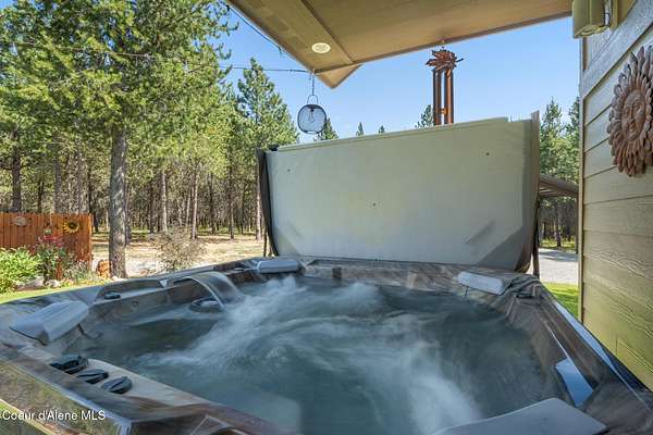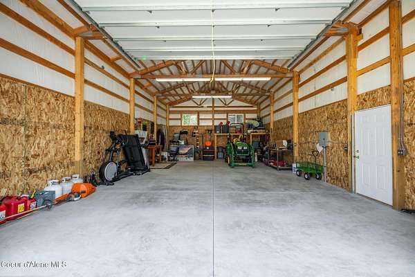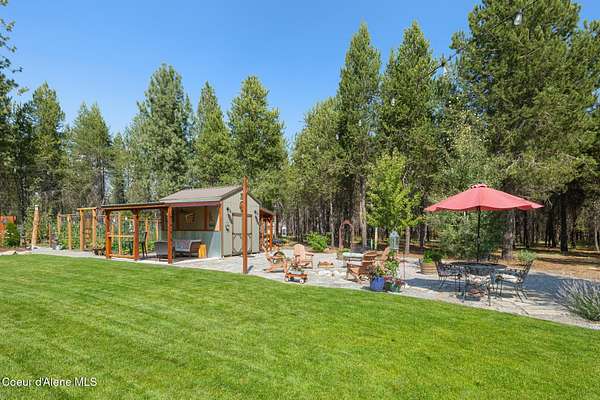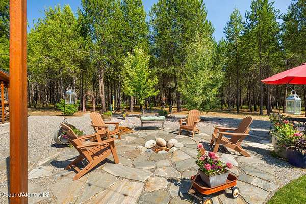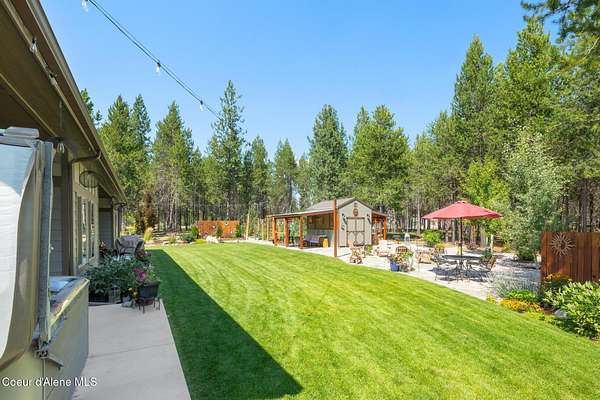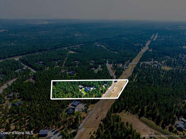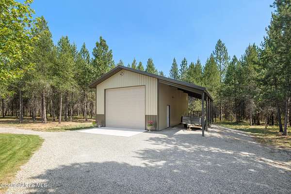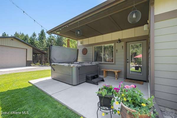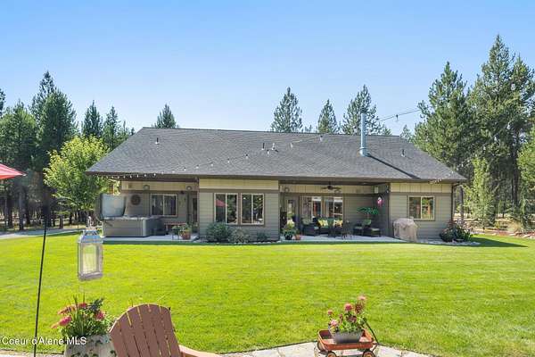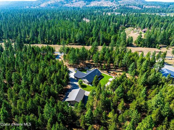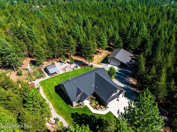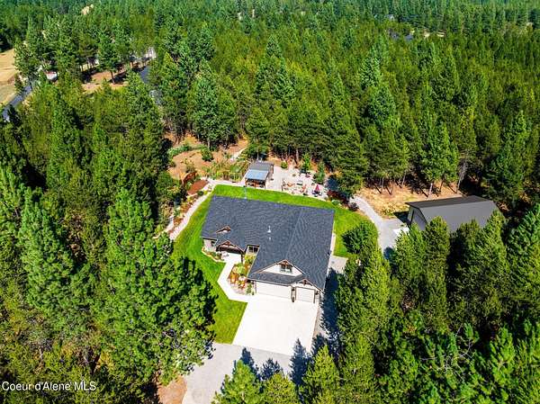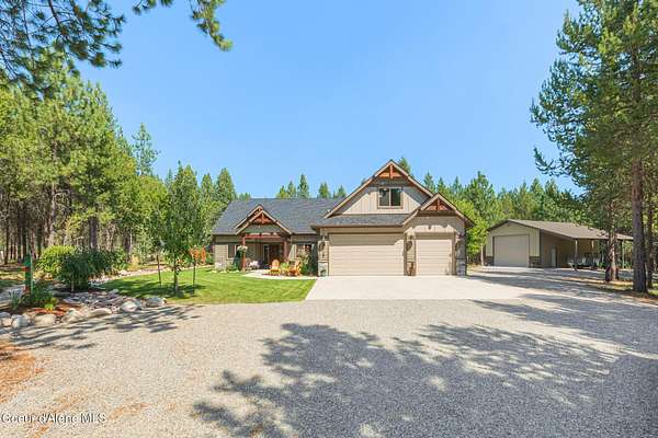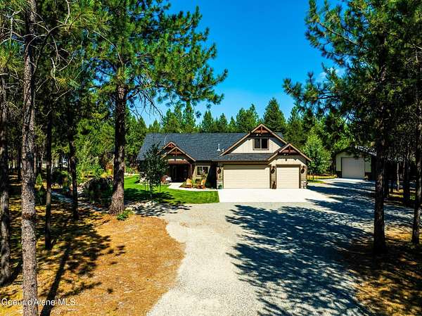 Welcome to Lone Mountain Estates, an exclusive community with 5-acre lots, paved roads, and easy access to Coeur d'Alene, Rathdrum, and Spirit Lake. This 2,359 sq ft single level home with bonus room features an open concept, wood burning fireplace, custom kitchen with stainless gas appliances, wine fridge, granite surfaces and a walk-in pantry. The luxurious master suite offers covered patio access to your hot tub, a spacious walk-in closet, separate vanities, soaking tub, and a beautiful walk-in shower. Additional highlights include vaulted ceilings, covered patio, a versatile bonus/media room and a mudroom/laundry room with sink. Finally, a large 24x40 shop with 12x40 lean too & 14' doors & RV parking complete this residence. The property grounds are manicured with outdoor living space, a luscious fenced in 20'x32' garden w/irrigation, fire pit, storage shed and barbecue area, making it an entertainers dream. This exclusive location has a private drive offering solitude like no other in the neighborhood.