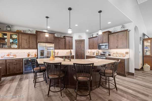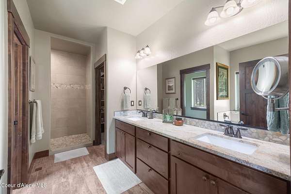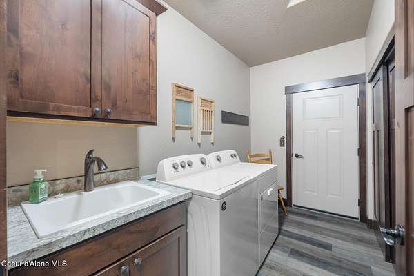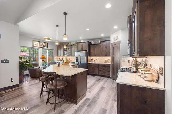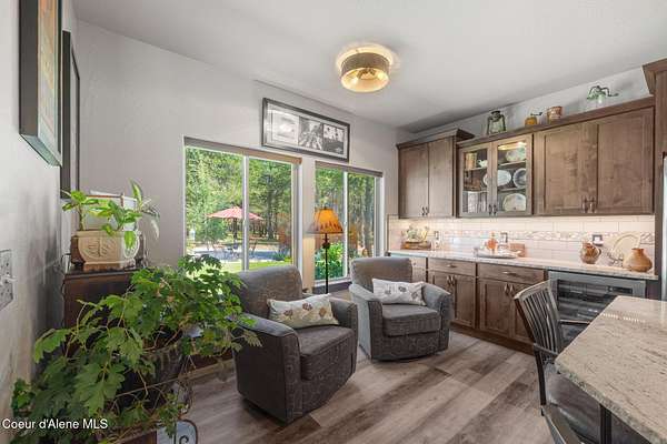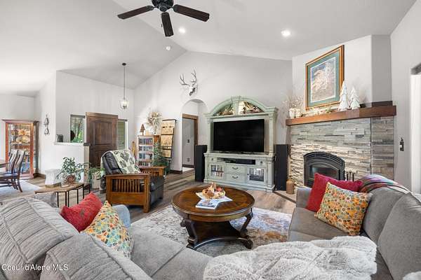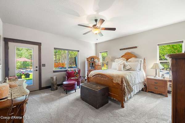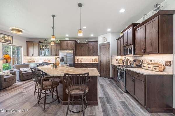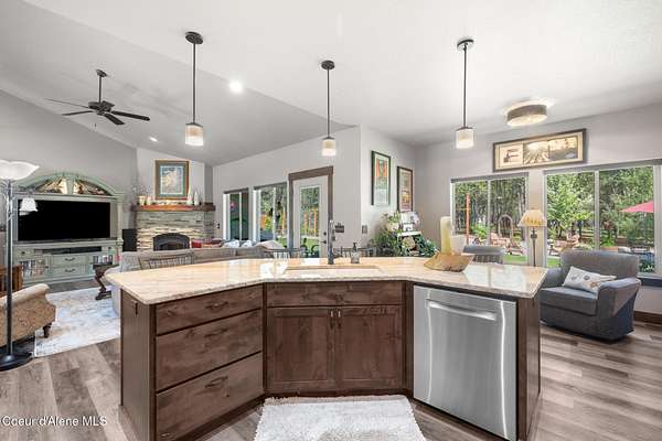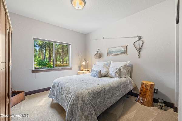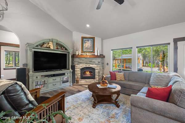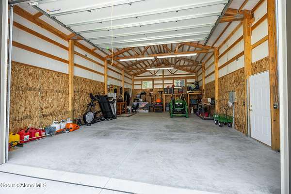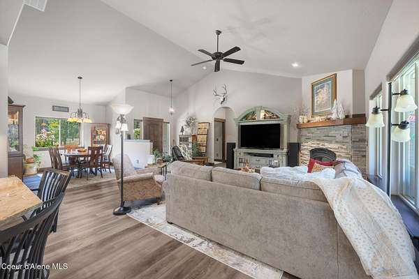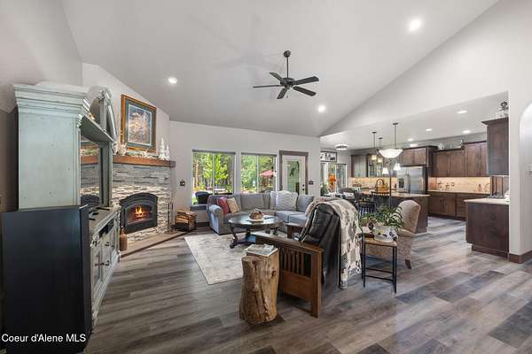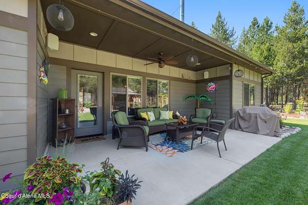 Welcome to Lone Mountain Estates, an exclusive community with 5-acre lots, paved roads, and easy access to Coeur d'Alene, Rathdrum, and Spirit Lake. This 2,359 sq ft single level home with bonus room features an open concept, wood burning fireplace, custom kitchen with stainless gas appliances, wine fridge, granite surfaces and a walk-in pantry. The luxurious master suite offers covered patio access to your hot tub, a spacious walk-in closet, separate vanities, soaking tub, and a beautiful walk-in shower. Additional highlights include vaulted ceilings, covered patio, a versatile bonus/media room and a mudroom/laundry room with sink. Finally, a large 24x40 shop with 12x40 lean too & 14' doors & RV parking complete this residence. The property grounds are manicured with outdoor living space, a luscious fenced in 20'x32' garden w/irrigation, fire pit, storage shed and barbecue area, making it an entertainers dream. This exclusive location has a private drive offering solitude like no other in the neighborhood.