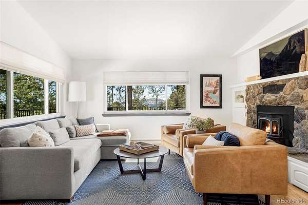 Inside, the open-concept main level features a bright kitchen, dining area, and a vaulted living room designed for easy gathering and everyday living. Cozy up to the fireplace while enjoying mountain views and a lot of morning sunshine. This level also includes three bedrooms plus an office or non-conforming room. The spacious primary suite offers two closets (including a walk-in), a full bathroom, skylights that fill the room with natural light, and private access to the deck and hot tub. Fresh paint &new carpet bring a fresh feel to the home.