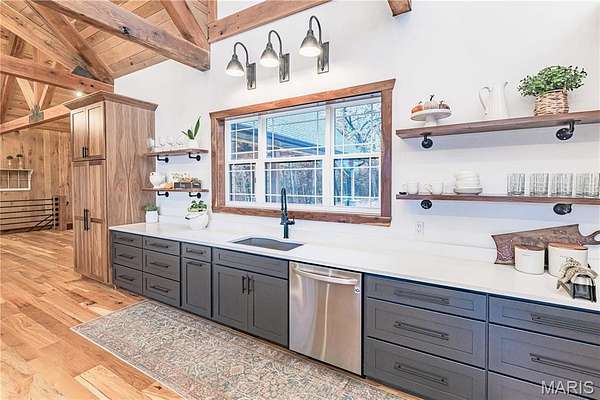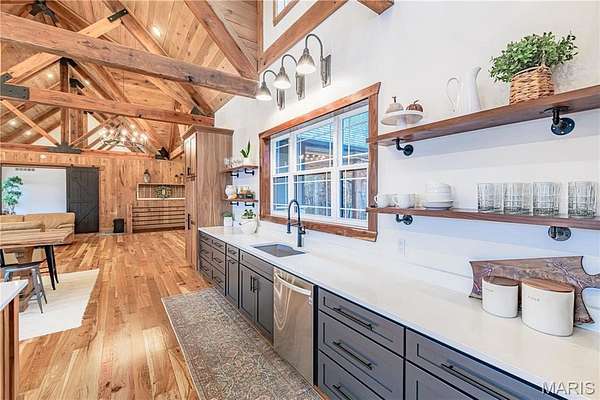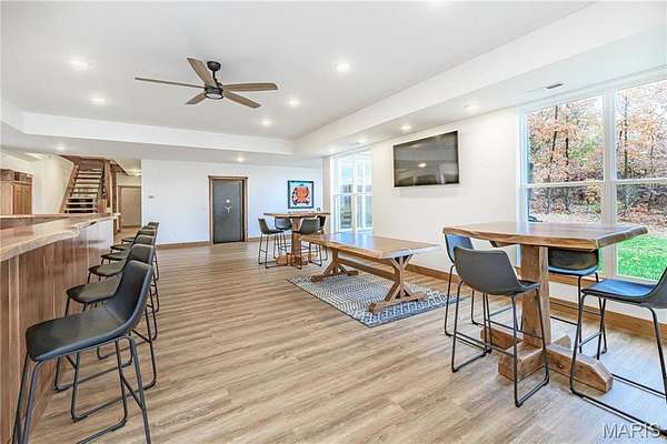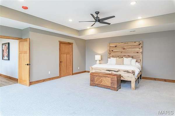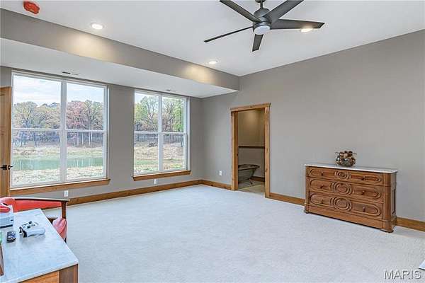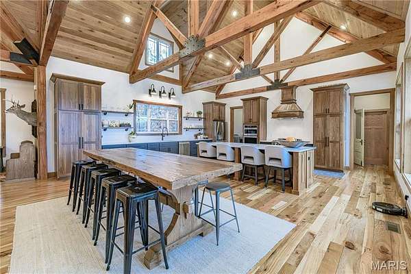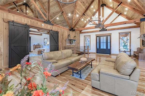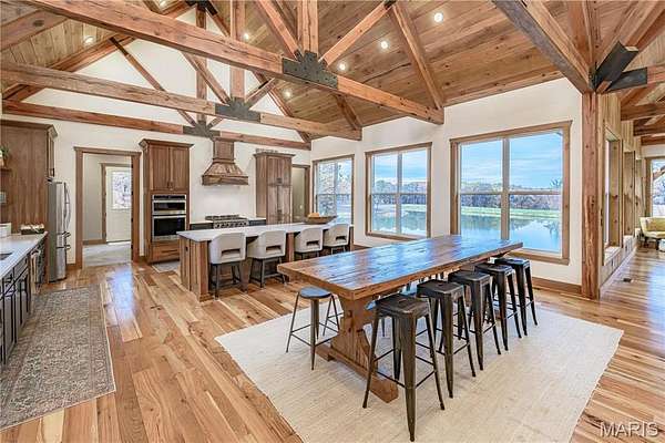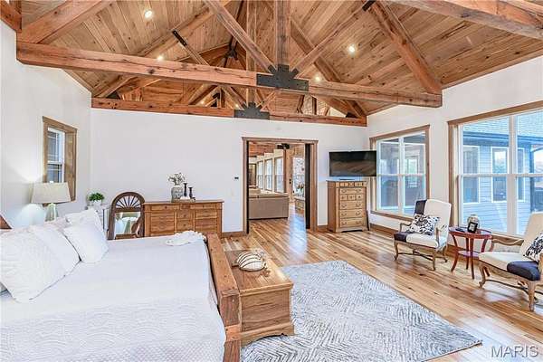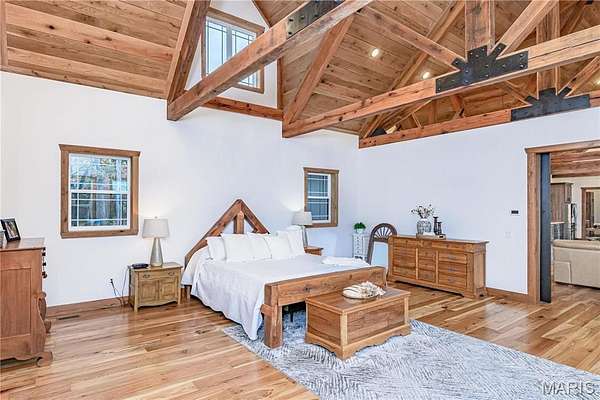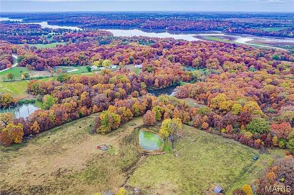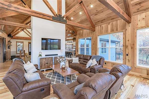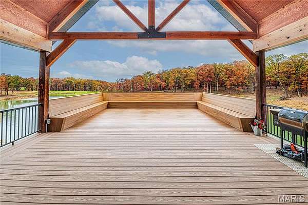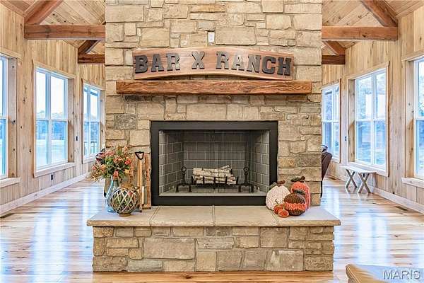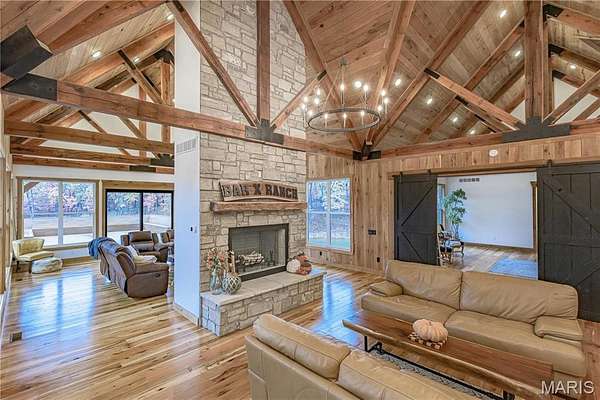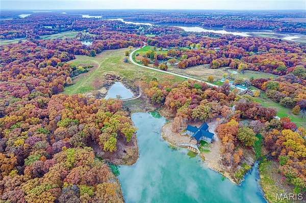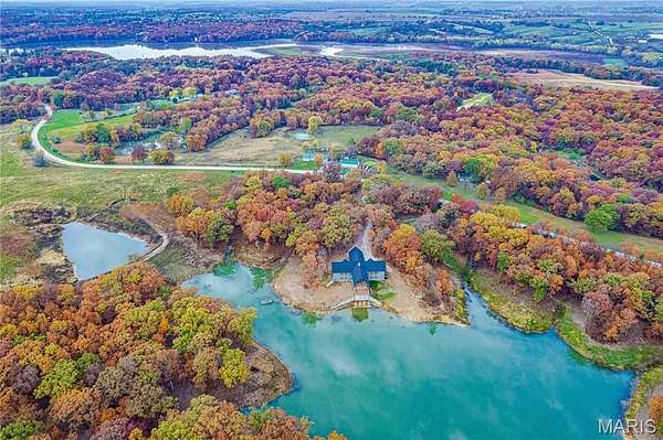 A Hunters, Boaters, Fishermans & Entertainers dream! Over 50 acres of combined property with a 6000+ sq ft custom built home of magnificent craftsmanship in this country estate. Your new getaway home is situated on over 7 acres & adjoins/overlooks your private, co-owned stocked (Walleye, Crappie, Channel Cat & Minnows) 10 acre lake in a spectacularly private setting with your additional 40 acres for hunting, hiking, etc within 5 minutes. Also, it is only a few minutes to a boat launch onto 1800 acre Long Branch Lake for all your future water sports fun. Covered portico leads to simple magnificence & the unbelievable view from every room upon entering into the foyer for your first look at the breathtaking great room with floor to ceiling see through stone fireplace shared with the hearth/family room that leads to a massive deck overlooking your lake for great fishing and stunning sunsets. The mind blowing Chef’s kitchen features gorgeous Amish made custom cabinetry, two giant islands, solid surface countertops, access to a huge mudroom and fantastic custom beverage area. Spread out over two floors the 3 primary suites, main level suite featuring beamed & vaulted ceiling and incredibly spacious on suite primary bath, two lower suites also boasting spacious and private areas, both with that exceptional view. Entertain in the large, light filled 2nd social area in the lower with huge custom bar that walks out to another large patio area for more outdoor entertaining. There is also a unique & EXTRAORDINARY safe room/office with bank vault entry door that you simply must see to believe! Filling out the lower is the perfect set up for your Wine Cellar. This is the ultimate getaway close enough to use every weekend. Majority of lumber used harvested from the property. 900 ft. of poured concrete driveway, completion TBD. Possible Seller financing available. Suitable for Bed/Brkft. 2025 taxes do not include the additional 40 acres recently added to the property offerings.