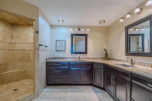 The large primary suite features wood flooring and has large windows with lakefront water views and has French doors out to the pool/patio area. The primary bathroom includes double vanities with granite counters, walk in shower with tile work to ceiling, and his and her closets.