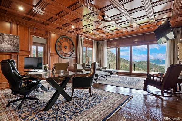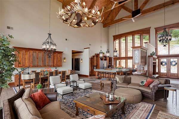 Welcome to the Rocky Mountain Retreat, the epitome of luxurious living in a custom palatial residence perched atop Deer Mountain in the gorgeous town of Estes Park. This remarkable residence offers unparalleled privacy and exclusivity. Crafted with meticulous attention to detail, this exceptional estate boasts the finest materials and craftsmanship, showcasing exquisite Mountain Contemporary architecture. With soaring ceilings and grand spaces, every aspect of this home exudes opulence and sophistication. A gated drive greets your arrival and leads to a large motorcourt with porte cochere. Upon entry you will be WOW'd by the 52' ceilings in the great room with massive windows framing sweeping mountain views, all the way to Lake Estes. Outside, a dual island outdoor kitchen is the centerpiece of the outdoor entertaining space, a large hot tub covered by pergola is a serene and picturesque setting. Step inside to discover a world of elegance and grandeur, with spacious living areas designed for both lavish entertaining and intimate gatherings. The gourmet kitchen, outfitted with top-of-the-line appliances, is a chef's dream. Retreat to the sumptuous primary suite, complete with a wet bar, gas fireplace, luxurious bathroom and patio access. Five additional bedrooms are all spacious and bright with outdoor access, walk-in closets and ensuite baths. Upstairs, the private study is outfitted with a wet bar, gas fireplace, wood panelling, and bath with steam shower. A private terrace makes the space an ideal getaway. Media room ensures that every comfort and convenience is catered to. On 68 acres, the utmost privacy and tranquility is realized only 10 minutes to Rocky Mountain National Park. With its idyllic location, impeccable craftsmanship, and unparalleled amenities, this mountain masterpiece offers a rare opportunity to experience the ultimate luxury living in Estes Park.
