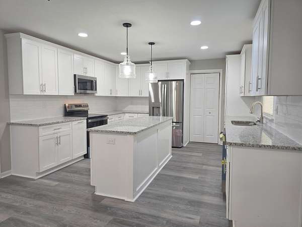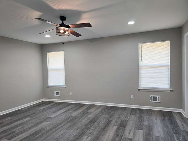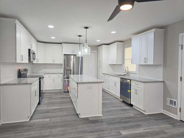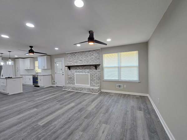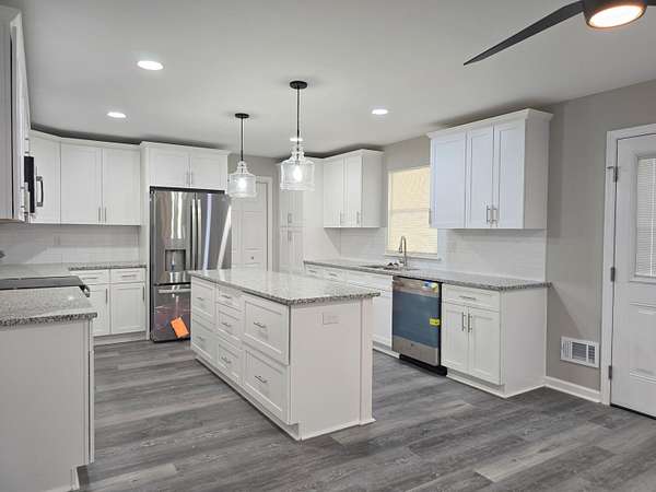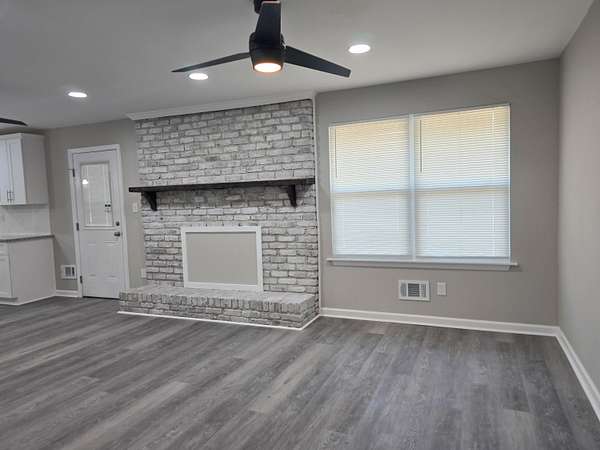 Available for February occupancy! Newly remodeled home on 2.5 acre lot with no HOA! Four bedroom, three bedroom home with no carpet! Large, partially fenced yard, covered, rocking chair front porch leads to entry foyer with coat closet. All flooring in the home is luxury vinyl plank and tile. Foyer leads to open floor plan living, dining and kitchen space. Living space has ceiling fan and fireplace mantel/hearth (decorative only). Adjacent dining area with separate ceiling fan and door to backyard. Large kitchen with brand new cabinetry, granite counters, brand new stainless appliances, kitchen island, subway tile backsplash, generous storage and prep space. Primary bedroom located off dining area, has ceiling fan, blinds, walk in closet. En suite primary bath has dual sink vanity, mirrors and light fixtures, walk in shower with floor to ceiling tile surround with storage niche. Split bedroom plan, 2nd, 3rd and 4th bedrooms located on hall off foyer. Hallway has large double bifold door linen closet and hall bathroom with single sink vanity and 2nd and 3rd bedrooms with ceiling fan, blinds. Fourth bedroom has ceiling fan, blinds, walk in closet and it's own en suite bath with single sink vanity and walk in shower. Laundry room off kitchen with generous storage space and washer/dryer hook up, access to backyard and garage. Two car garage with two cabinet/workstation and two large storage closets with shelving. Covered rear patio with ceiling fan and two different levels and very large, partially fenced backyard. #goodtoask