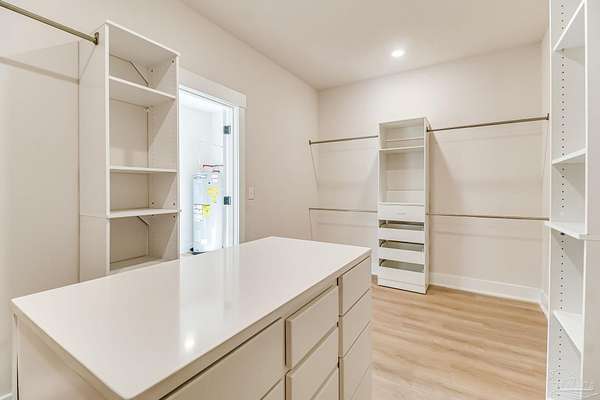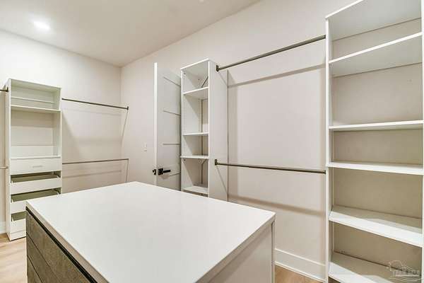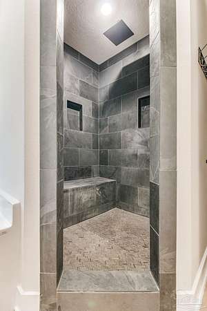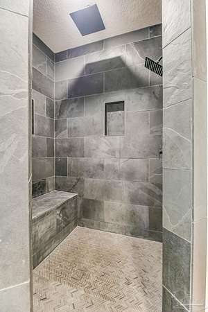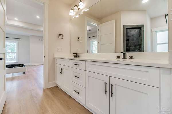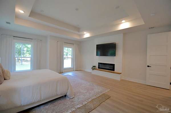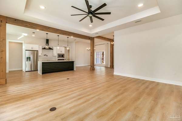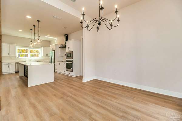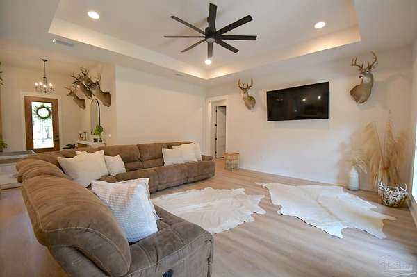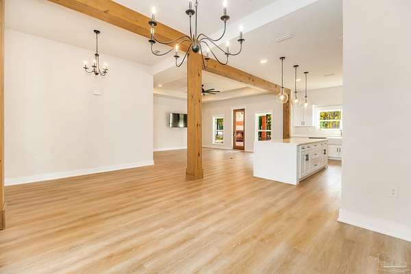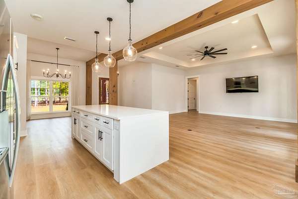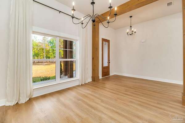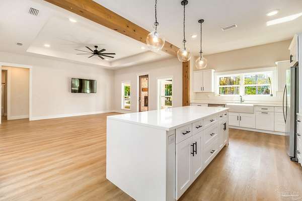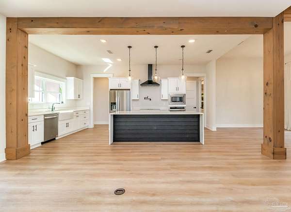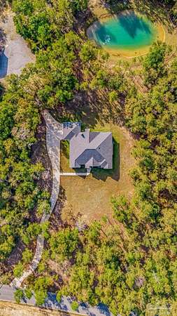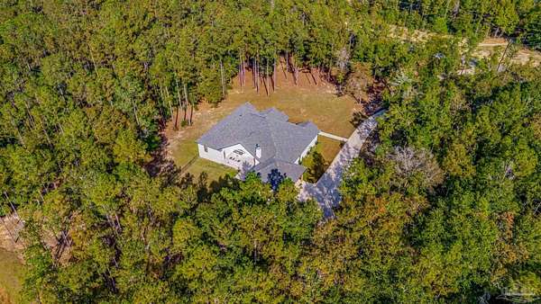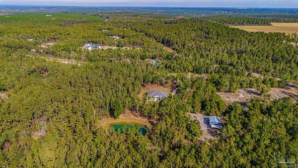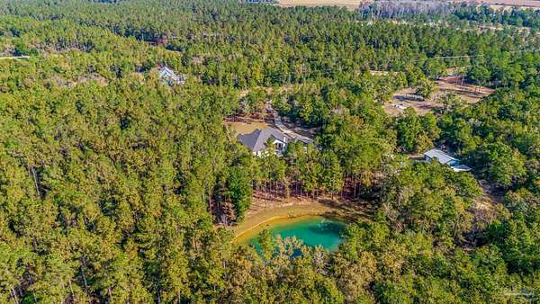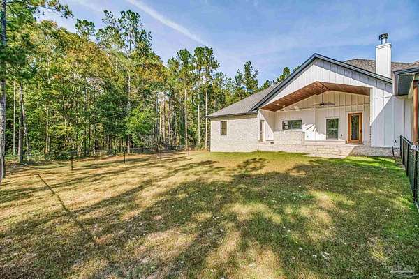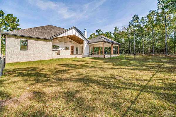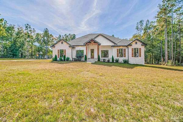 Introducing a stunning custom home on 5.27 acres in the heart of Pace. This newer-construction property offers the perfect blend of modern comfort, timeless finishes, and peaceful country living -- all in a centrally located, highly desirable area. Step inside to an open, split floor plan with luxury vinyl plank flooring throughout. The kitchen features quartz countertops, white cabinetry, stainless-steel appliances, and a spacious island overlooking the dining area and living room. The living room is bright and inviting with recessed lighting and a tray ceiling accented by beautiful wood beams. The primary suite is a true retreat with natural light, tray ceiling detail, and an electric fireplace. The spa-like primary bath offers a walk-in tiled shower, separate garden tub, and double vanity. One of the standout features of this home is the oversized master closet with direct access to the laundry room, which also leads straight out to the back porch for everyday convenience. Outside, you'll find brick and Hardi-plank siding with gutters, along with a large back porch designed for year-round enjoyment. This outdoor living space includes a brick fireplace and outdoor kitchen, creating the perfect spot for entertaining or relaxing after a long day. A 2-car carport sits on the left side of the home, offering convenient access to the back porch, laundry room, and main living area. Additional property features include a private well, septic tank, long winding concrete driveway, beautiful pond, and a 26x36 barn with 14' eaves, two 12'x10' roll-up doors, a walk-through door, and gutters. This gorgeous homestead checks every box -- privacy, acreage, thoughtful design, and an unbeatable Pace location. A must-see property!