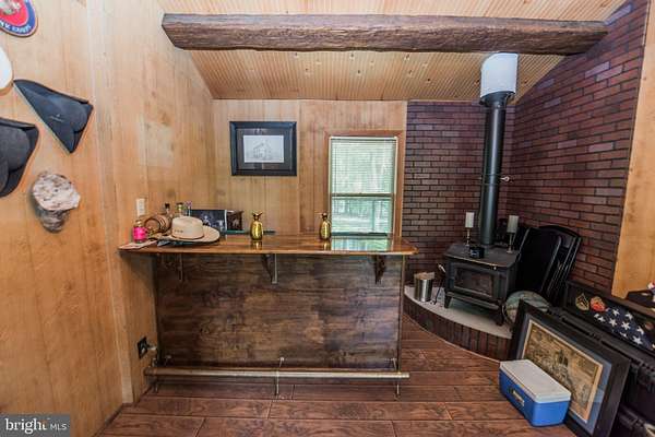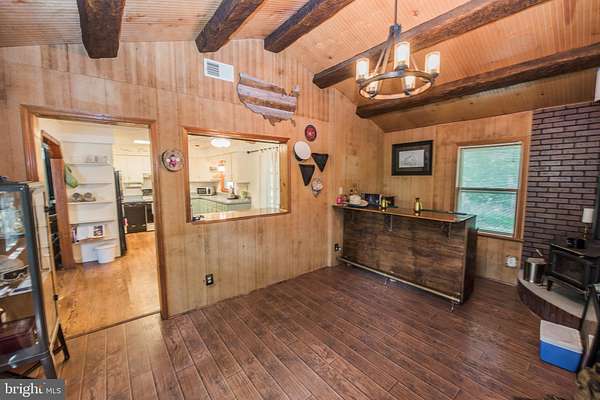 - Bar, Ceiling Fan(s), Combination Kitchen/Dining, Eat-In Kitchen, Exposed Beams, Family Room Off Kitchen, Traditional Floor Plan, Window Treatments, Wood Stove