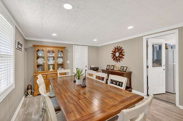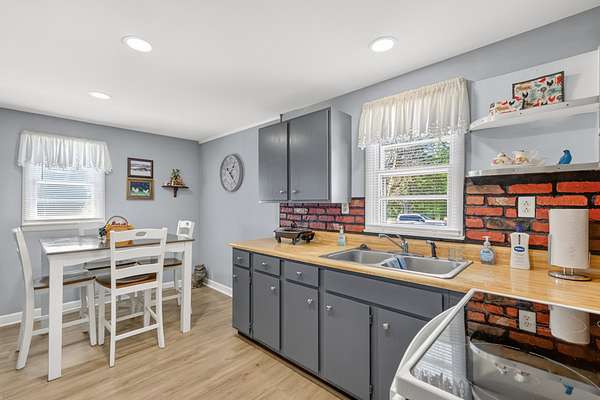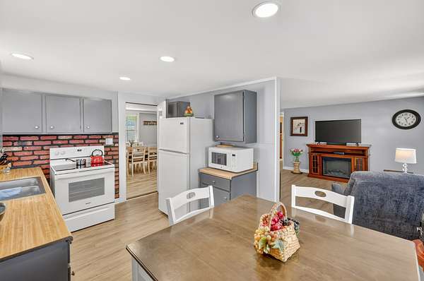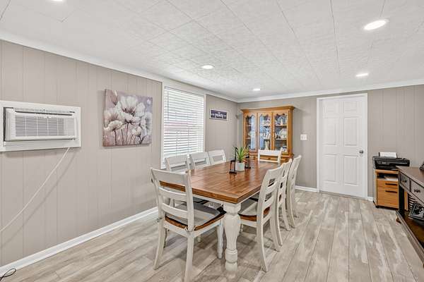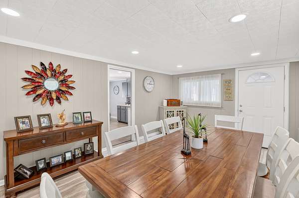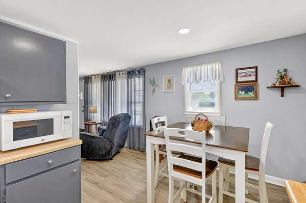 The main living area flows seamlessly into the eat-in kitchen, featuring gray cabinetry and functional workspace for everyday living. A separate dining room provides additional room for gatherings and entertaining. A standout feature is the converted garage, now a spacious den or flex space—ideal for a second living area, home office, or hobby room.