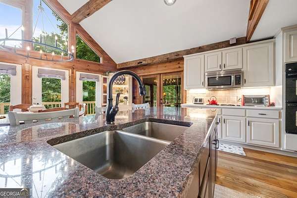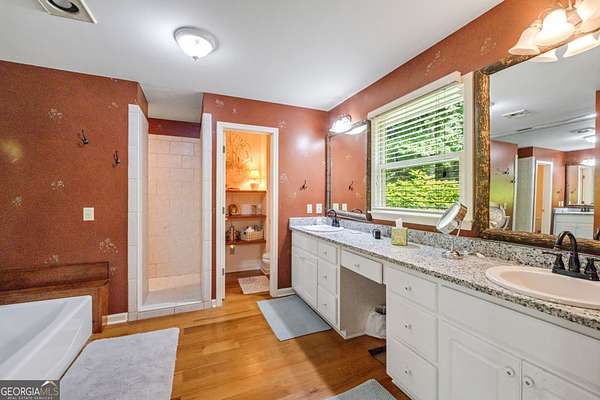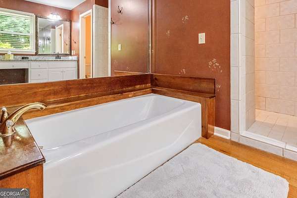 - Beamed Ceilings, Bookcases, Double Vanity, High Ceilings, In-Law Floorplan, Master On Main Level, Separate Shower, Soaking Tub, Split Bedroom Plan, Tile Bath, Vaulted Ceiling(s), Walk-In Closet(s), Wet Bar