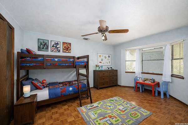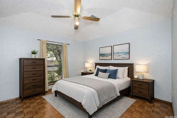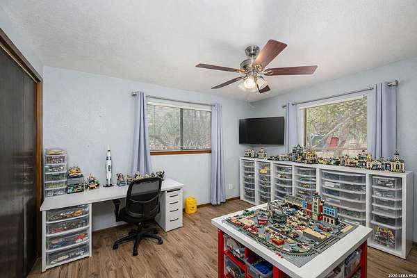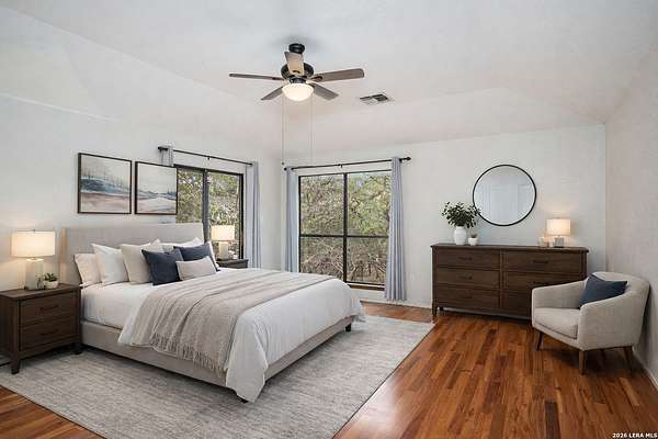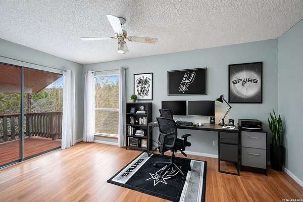 Feel like you are on your own private mountain as you look out over the tree tops. Unique and airy hillside home sits on two and a third tree covered acres in desirable Cross Mountain Ranch. Covered decks off the dining room, family room & study showcase the private sanctuary. Even a deck off the primary bedroom! Hardwood floors throughout level two and on stairs! Wood ceilings in primary bath & kitchen! Dual closets in primary bath. Soaring ceiling include clearstory windows in family room with cozy, brick, corner fireplace. Utility sink in laundry room. Entry is on level two - the main level. Level one holds private, primary bedroom suite with dual closets, separate Roman shower & tub, outside access and also the side entry two-car garage. Family room, formal dining and study with even better views on level three. Live oak studded yard contains several outbuildings including a greenhouse! Surrounding properties sell for much more than asking price, which reflects the updating needed in the home.