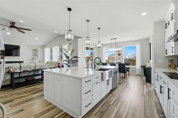 At the heart of the home is a beautifully reimagined gourmet kitchen featuring elegant quartz countertops, an expansive island, and a walk-in pantry—perfectly designed for both everyday living and elevated entertaining. The open-concept living area is filled with natural light and anchored by a striking stone-accented fireplace, creating a warm yet sophisticated atmosphere.