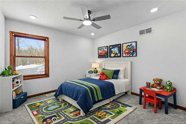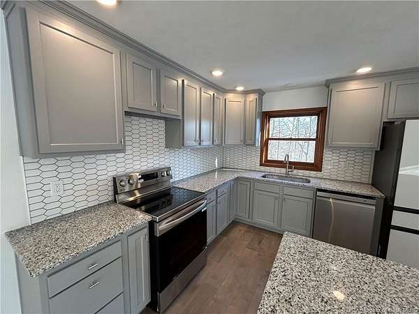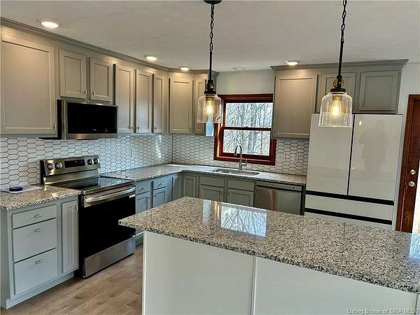 Welcome to this beautifully updated 3-bedroom, 4-bath home offering nearly 3,000 square feet of finished living space, situated on 4.475 partially wooded acres in the highly sought-after Floyd Central School District. This property delivers a rare blend of space, privacy, and modern upgrades. Inside, the home features new flooring throughout, fresh paint, and updated light fixtures, along with nicely renovated bathrooms. The primary bathroom includes a tile walk-in shower and dual vanities, while the remaining bathrooms have been tastefully updated with new vanities and finishes. The kitchen has been upgraded with new granite countertops, cabinetry, and appliances complementing the home's beautiful wood trim and inviting living spaces. A striking stone fireplace serves as a focal point on the main level. The first-floor primary suite offers convenience and comfort and features French doors that add architectural charm. The Walkout finished basement expands the living space with a recreational area, full bathroom, and decorative wood-burning stove, providing flexibility for entertaining, hobbies, or relaxation. Outdoor highlights include a wrap-around porch overlooking the partially wooded acreage, spot for a hot tub along with a detached 2-car garage and a barn for storage or additional uses. Move-in ready and full of character, this home offers space, updates, and an exceptional setting-just minutes from Highlander Point, Floyd Central schools and Southern Indiana amenities.