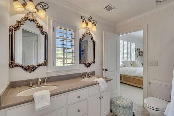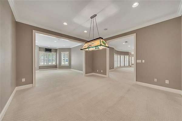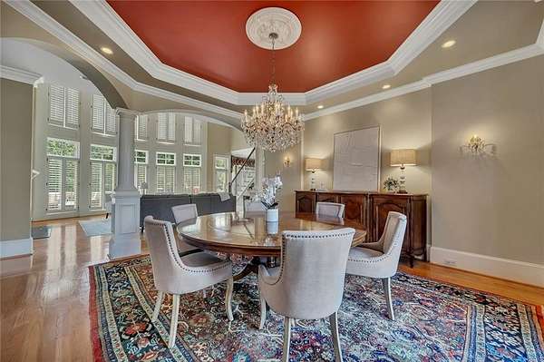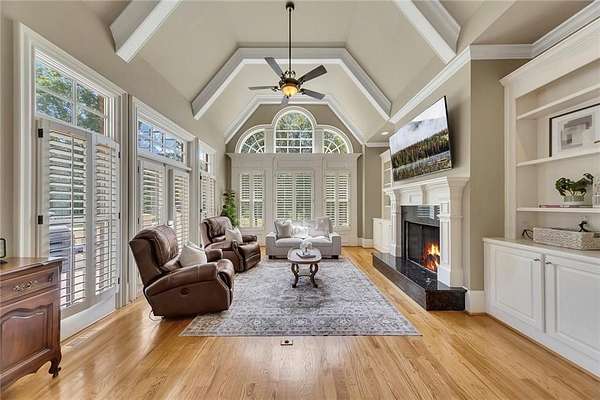 Enjoy multiple living spaces including a two-story great room with coffered ceiling, gas fireplace, built-ins, and a wall of windows plus family room off the kitchen with 2 walls of windows, fireplace and bookcases. Formal banquet-sized dining room with columns and heavy trim detail. Biltmore Style back patio with stamped concrete & curved stairs to private backyard