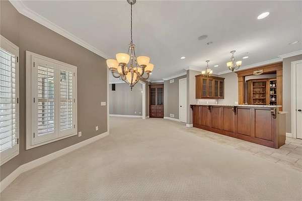 The finished terrace level is an entertainer's dream, featuring a great room, rec room, theater room, bar with dishwasher & sink, wine cellar, bedroom, full bath, and access to the covered stamped-concrete patio overlooking the pond.