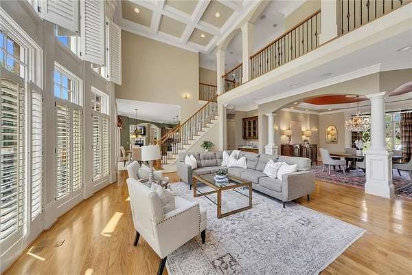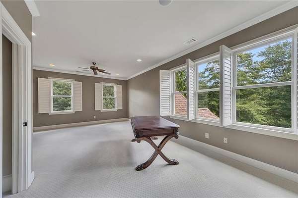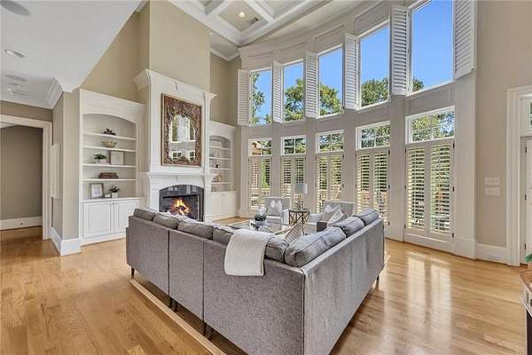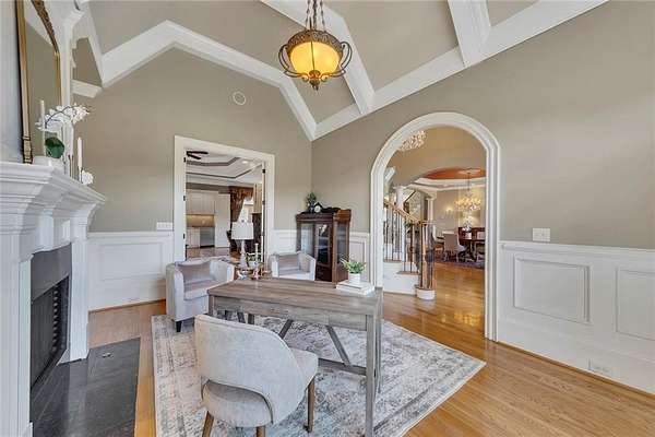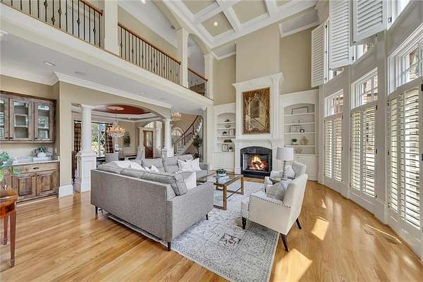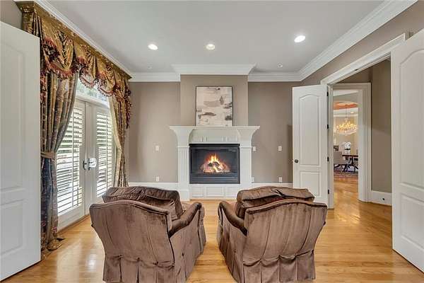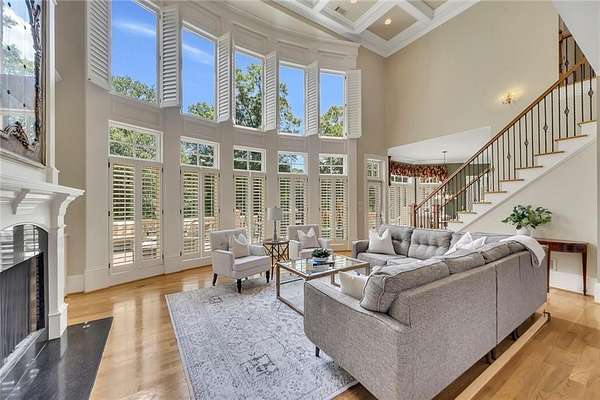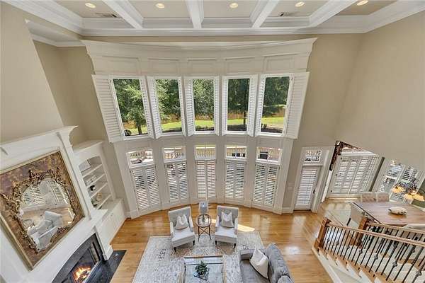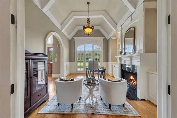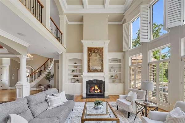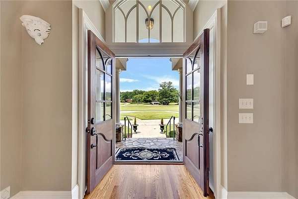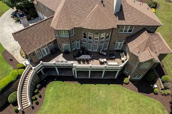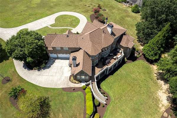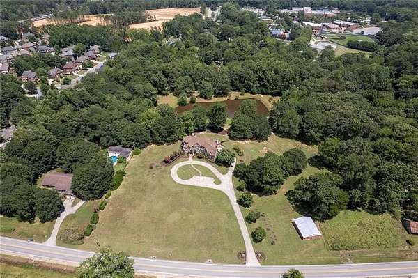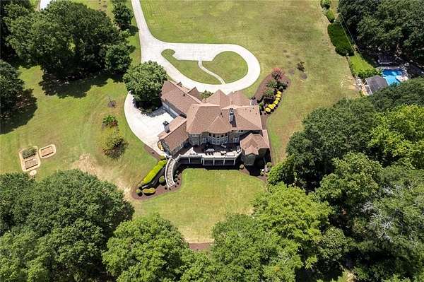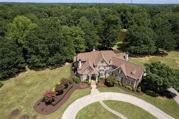 BACK ON the MARKET- Seize this incredible opportunity! The buyer's plans chaned and now this Executie Estate is available for YOU! Welcome to this stunning four-sided brick executive estate situated on 8+ private acres featuring a spring-fed, 2-acre stocked pond. This luxurious residence offers elegant architectural details, custom trim throughout, and soaring ceilings designed for both grand entertaining and comfortable everyday living. The two-story foyer with a curved staircase and iron balusters sets the tone for the home's craftsmanship. French doors lead to a vaulted library with exposed beams, marble gas fireplace, and built-in bookcases. The main-level owner's retreat features a sitting area with fireplace, private coffee bar with sink and refrigerator, custom walk-in closet, and a spa-inspired bath with dual shower heads, whirlpool tub, double vanities, and a picture window overlooking the pond. The heart of the home is the chef's kitchen, complete with: Wolf 6-burner + griddle & double oven, Sub-Zero refrigerator & stainless appliances including Wine cooler, ice maker, warming drawer & butler's pantry. Angled butcher block island & breakfast room with wall of windows Enjoy multiple living spaces including a two-story great room with coffered ceiling, gas fireplace, built-ins, and a wall of windows plus family room off the kitchen with 2 walls of windows, fireplace and bookcases. Formal banquet-sized dining room with columns and heavy trim detail. Biltmore Style back patio with stamped concrete & curved stairs to private backyard The upper level offers 4 generously sized bedrooms and 3 full baths. The finished terrace level is an entertainer's dream, featuring a great room, rec room, theater room, bar with dishwasher & sink, wine cellar, bedroom, full bath, and access to the covered stamped-concrete patio overlooking the pond. Additional features include: 3-car side-entry garage, laundry room with sink & cabinetry, central vacuum system, whole-house generator, irrigated by designated private well and new roof, circular driveway with ample parking ideal for entertaining. Convenient to shopping, medical, airport & Battery (home of the Braves) Experience the perfect blend of privacy, luxury, and serene outdoor living in this breathtaking estate.