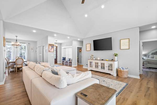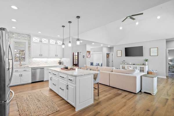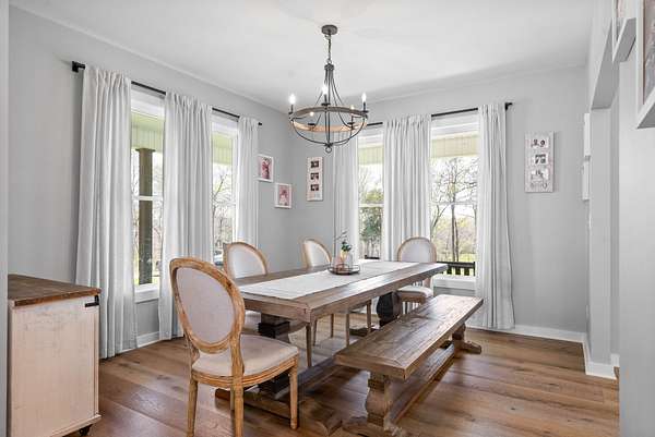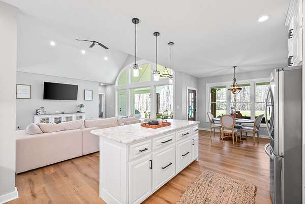 Welcome to your dream modern farmhouse, an exquisite three-story retreat nestled on a sprawling five-acre estate. This stunning home features cathedral ceilings and wide plank wood flooring throughout, creating a warm and inviting ambiance.