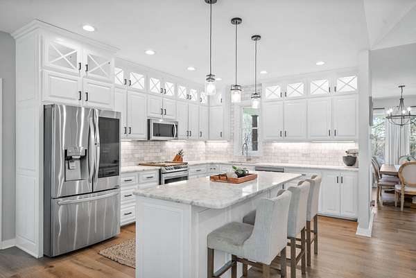 The heart of the home is the expansive kitchen, boasting luxurious marble countertops and a cozy breakfast nook, perfect for morning gatherings. Adjacent is a formal dining room, ideal for entertaining guests. With four spacious bedrooms, including a master suite with elegant finishes, and three and a half beautifully designed baths, comfort is paramount.