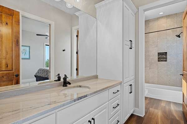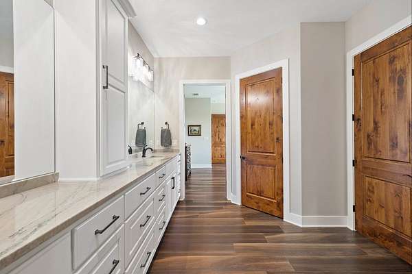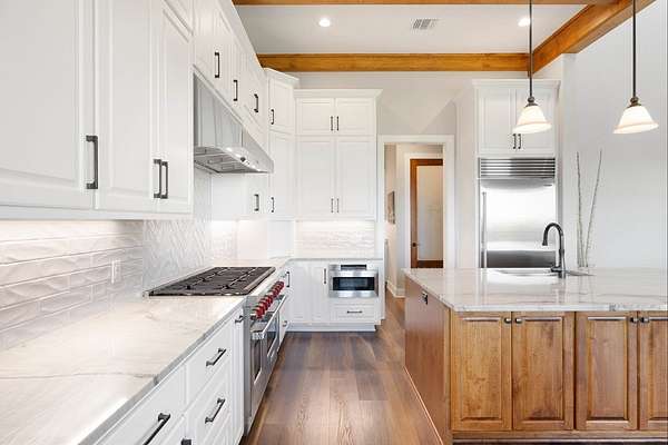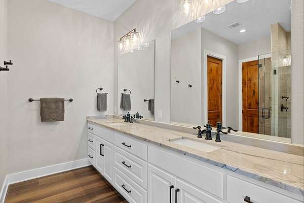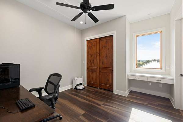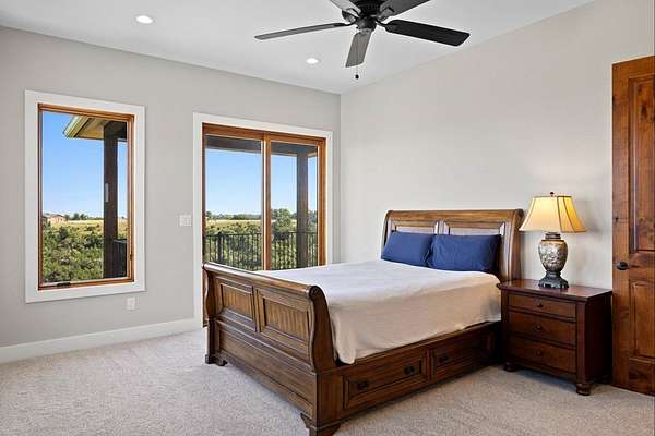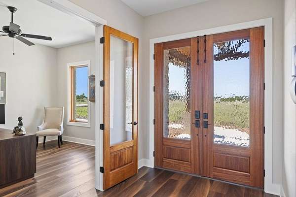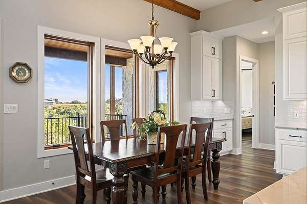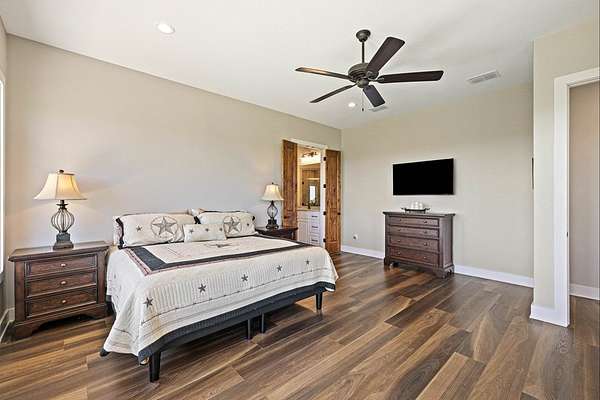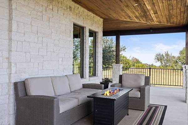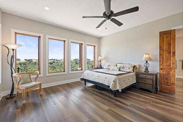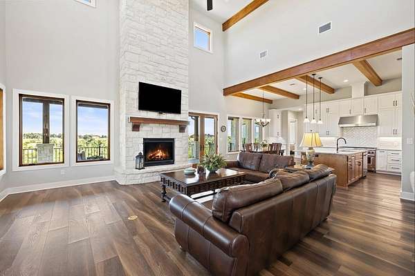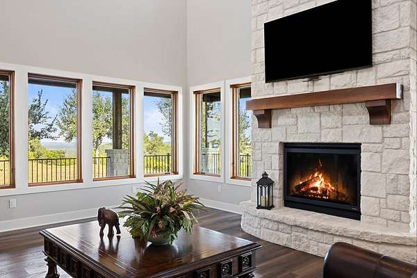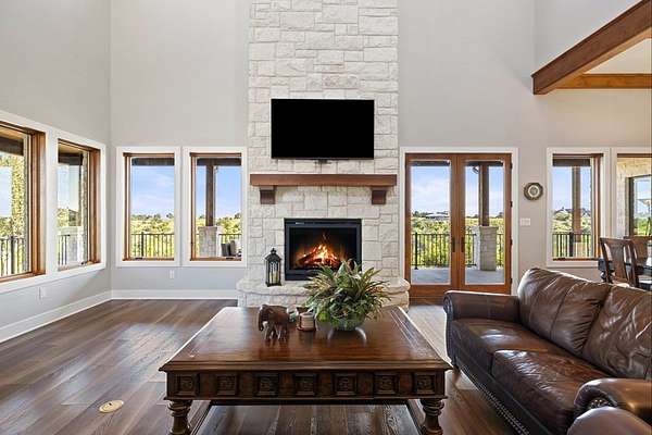 Experience refined Hill Country living on this private 5.23 acre retreat in the prestigious Ranches of Brushy Top. Perfectly positioned on a scenic hillside, this recently constructed 3,436 square foot residence blends elegant design with the natural beauty of its surroundings. Step inside to soaring ceilings, luminous oversized windows, and long-range views that fill every room with light. The chef's kitchen is a true centerpiece, boasting beamed ceilings, built-in appliances, a generous walk-in pantry, and an expansive wet bar. The spacious living room, anchored by a striking stone fireplace, offers a warm yet sophisticated setting for gathering. The thoughtful floorplan includes dual primary suites--one on each level--each with luxurious baths, walk-in closets, and private retreats, including an upper-level suite with a covered deck. Impeccable hardwood floors flow throughout the main level, complemented by a home office, large laundry room, and seamless access to outdoor living spaces. A wraparound porch and covered entertaining area invite you to savor the serene Hill Country backdrop. Additional amenities include a 3-car garage, an extra 2-bay garage/workshop, and a 30K rainwater collection system. Beyond the home, the Ranches of Brushy Top community offers an unmatched lifestyle within its 2,000 acre high-fenced preserve. Residents enjoy a gated entrance, two stocked lakes for fishing, swimming, and kayaking, plus miles of scenic trails for horseback riding, hiking, or UTV adventures. The ranch is home to native and exotic wildlife including elk, blackbuck, sika, and oryx, offering a one-of-a-kind living environment. With 1-D-1 Ag exemption, no city taxes, and low association fees, this property pairs luxury with practicality. Ideally located just minutes from historic downtown Blanco and the Blanco River, and an easy one-hour drive to both Austin and San Antonio, this is Hill Country living at its finest.
