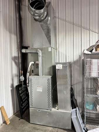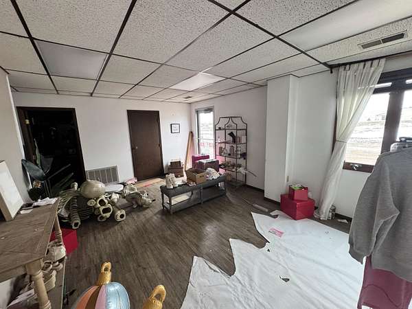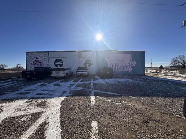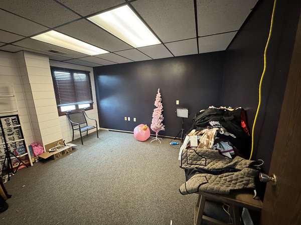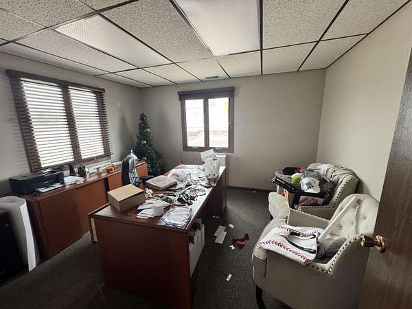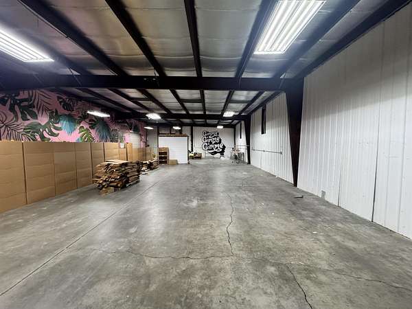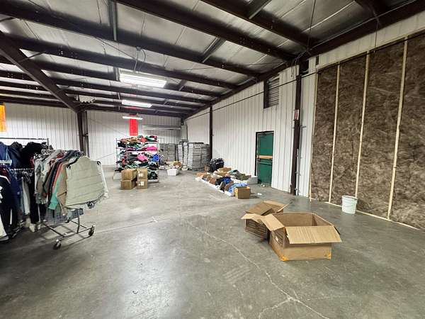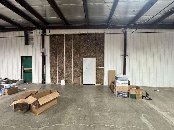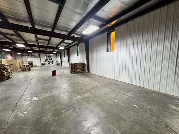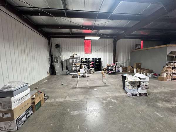 FOR LEASE: 11,200 sq foot red steel framed warehouse building with full concrete, forced air heat, central air, bathroom, office space, storage rooms, and endless possibilities. Norh end has two ground level 14` overhead door, South end has a dock and one 12` door. Additional 1120 sq foot office building with a bathroom as well..