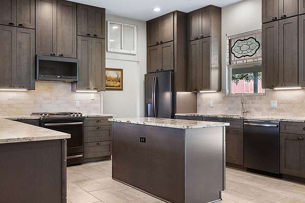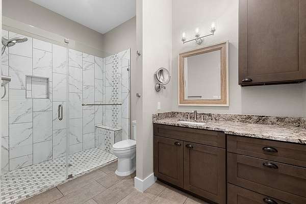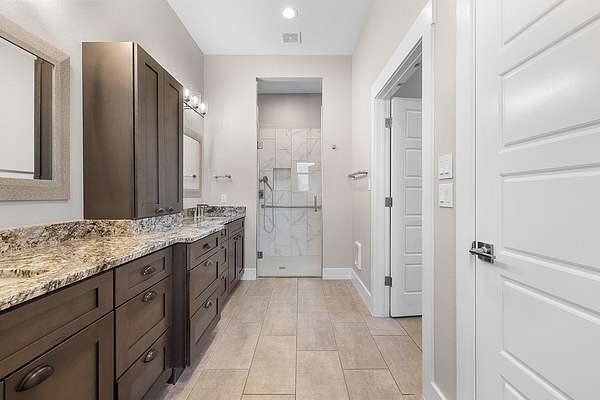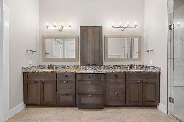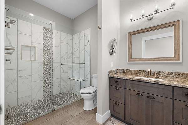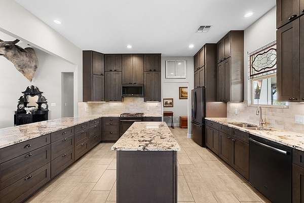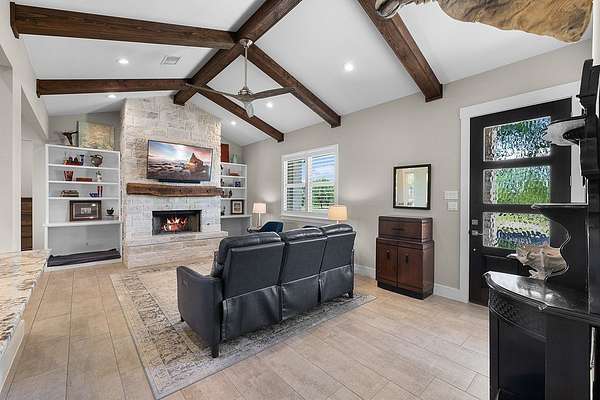 The custom-built 2,683 square foot home is thoughtfully designed with an excellent floor plan. Highlights include a spacious primary suite with a private office and luxurious bathroom, guest bedrooms with ensuite custom showers, a well-appointed kitchen featuring a large island and extensive cabinetry, a stone fireplace, and a generous laundry room.