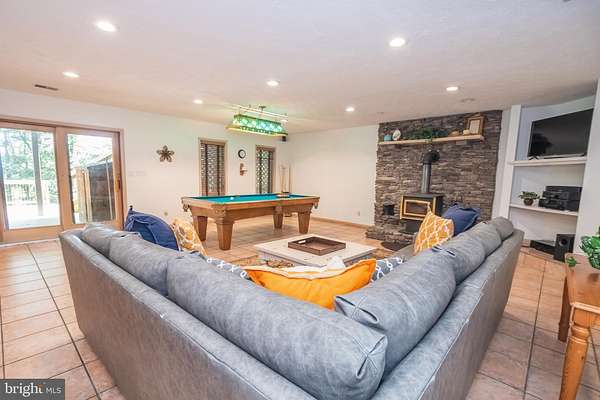 - Bar, Carpet, Ceiling Fan(s), Dining Area, Entry Level Bedroom, Family Room Off Kitchen, Open Floor Plan, Whirl Pool/Hot Tub, Wood Floors, Wood Stove