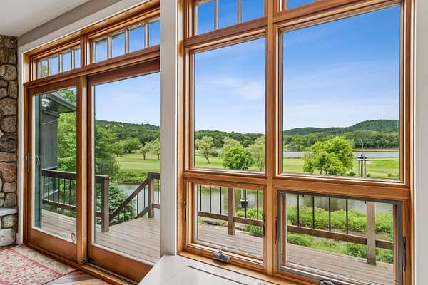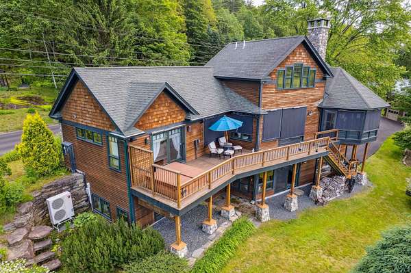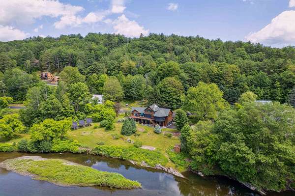 A beautifully constructed residence, designed to take in breathtaking views of the river, the Lakeland course of the Quechee club golf course, the Quechee ski slopes, and lake Pinneo. The house offers high-quality details inside and out including porches, stone patios, octagonal viewing/sitting rooms and more. Gourmet kitchen of with a large walk-in pantry, 2 river stone fireplaces, tigerwood flooring, warm natural woodwork and a flexible floor plan to add another bedroom. Beautifully updated powder bath. The 1st floor primary bedroom enjoys a large walk-in closet and large bathroom. Views enhance every room. Other amenities a hot tub, a sauna, direct access to the river and perennial flower beds. In addition to the paved circular driveway in front, there is a separate newly paved driveway to the 2-car attached garage, and a second, detached 2-car garage with extra storage. The main garage is finished with epoxy floors. A solar array and solar domestic hot water result in very low electric bills. Radiant heated floors. Air conditioning. Approx. 700' of river frontage. This home is not located in the QLLA (Quechee Club) but club membership may be obtained either through purchasing a "Quechee Lot" or with a two-year trial membership. Substantially all furnishings are included with the house. Easy access to the Upper Valley...enjoy the quaint town of Woodstock VT and the 8 minute drive back home! SEE FULL PROPERTY WEBSITE!