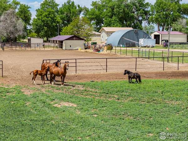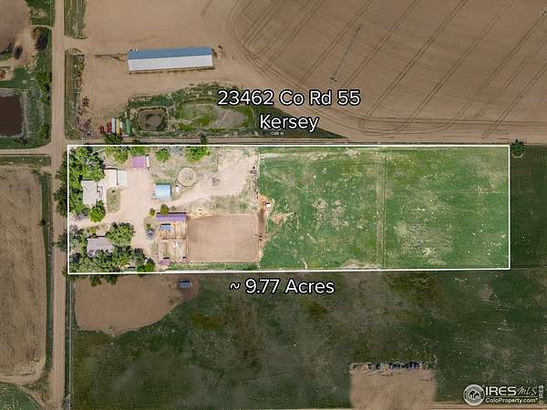 Something for the entire family to enjoy! Incredible 9.77-acre horse property with lush mature landscaping just minutes from Kersey, located in the highly desirable Platte Valley School District. Fully fenced and ideal for multi-generational living or income potential, this unique property offers two move-in-ready homes. The Larger home is 2672 square feet, a split level with 4 bedroom, 3 1/2 Baths, house has been freshly painted and new carpet has been installed. The secondary home is a 2,048 sq ft ranch-style with 3 beds, 3 baths, updated chefs kitchen with stainless steel appliances, and a private hot tub. Equestrian amenities include a 6-acre pasture, outdoor riding arena, horse runs with shelters and automatic waterers, and a converted dairy barn that serves as a tack room and additional shelter. The dedicated hay barn provides ample covered storage. The property includes Milton Reservoir irrigation rights and Bailey Ditch carrying rights, with potential to irrigate the pasture with some improvements. Additional features: a 1200 sqft oversized 3-bay garage, 1520 sqft Quonset hut shop, and multiple outbuildings-ideal for horses, livestock, or hobby farming. Just a short drive to Kersey, Greeley, Denver and DIA, this is true Colorado country living with space, comfort, and versatility.