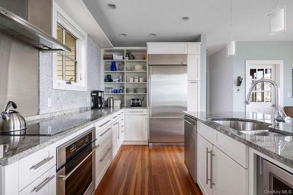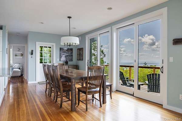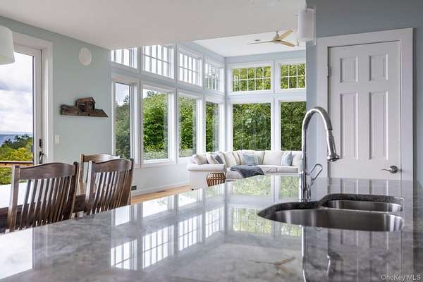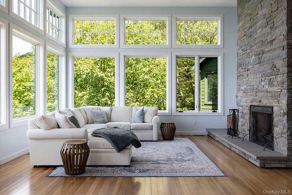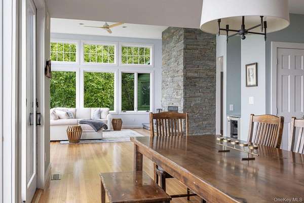 Wake to stunning sunrises and unwind to radiant sunsets from the comfort of your open floor plan living space, where a soaring floor-to-ceiling bluestone fireplace anchors the heart of the home. Expansive windows line the entire south-facing rear of the house, bringing the outdoors in and framing unforgettable vistas year-round.