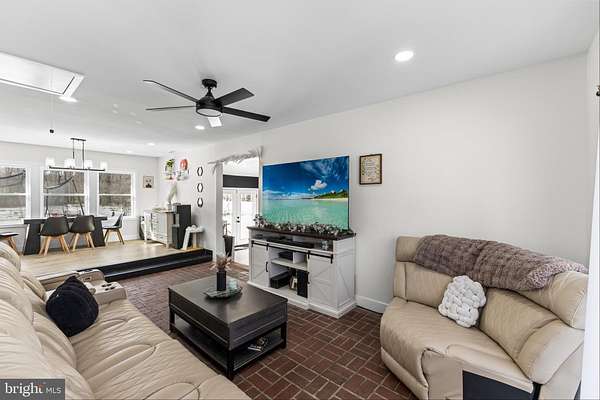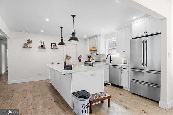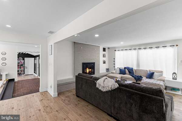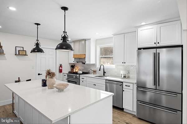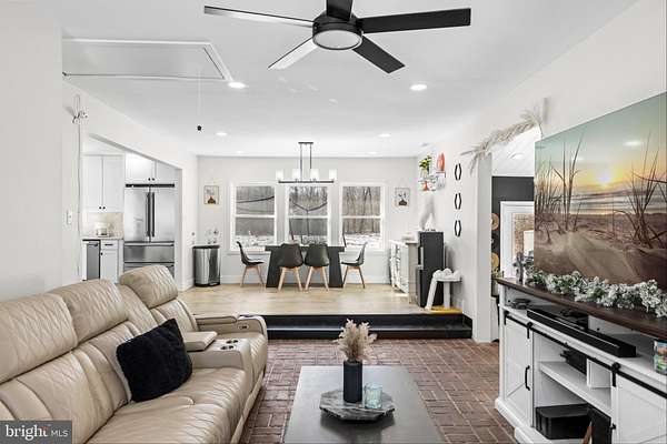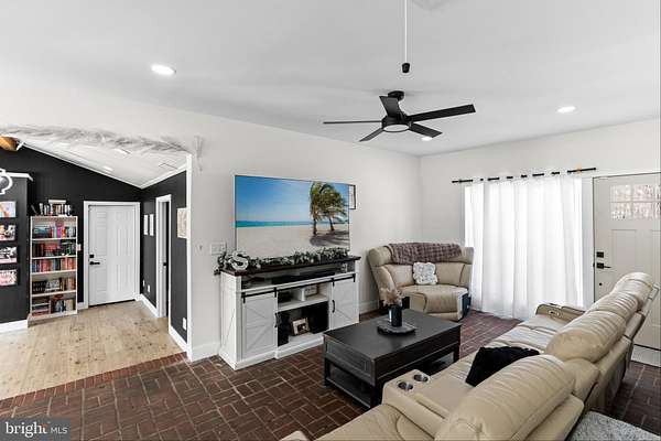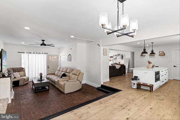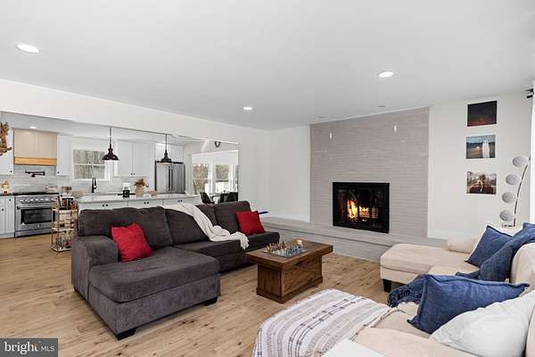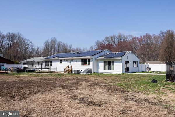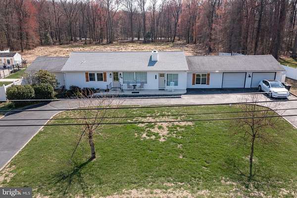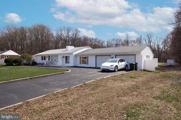 This fully renovated 4-bedroom, 2.5-bath modern farmhouse rancher offers a seamless blend of contemporary luxury and charm on a sprawling 1.71-acre lot with in ground pool and pool house. The heart of the home is a chef's kitchen, boasting pristine white cabinetry, a massive storage-rich island with bar seating, and premium quartz countertops. High-end features include a 5-burner stove with a pot filler, a tile backsplash, and stainless steel appliances. The primary suite serves as a true private retreat, offering a cozy sitting area, a large walk-in closet, and direct slider access to the pool area, complemented by a spa-like ensuite with a 72" double vanity and a custom walk-in tiled shower. The thoughtfully designed floor plan provides both elegance and versatility. A grand bonus room makes a statement with cathedral ceilings, shiplap detailing, and exposed beams, while the formal dining room overlooks a sunken family room featuring classic brick flooring. For cozy evenings, the living room centers around a warm brick fireplace. The fourth bedroom is tucked away on the opposite side of the residence, creating the perfect layout for an in-law suite, or a quiet home office. Practicality meets style throughout, from the spacious laundry room with a stackable gas washer/dryer to the generous guest bedrooms and well-appointed bathrooms with gorgeous features. Outdoor living is elevated by a serene wooded backdrop, an inviting gunite inground pool, and a pool house already roughed-in for plumbing. The exterior is equally impressive, featuring a circular driveway and an oversized two-car garage with a unique drive-through design that opens to a large patio. Surrounded partially by white vinyl fencing and equipped with eco-friendly Tesla solar panels, this property is a rare find that combines massive acreage with move-in-ready sophistication.