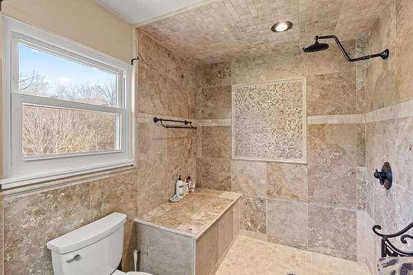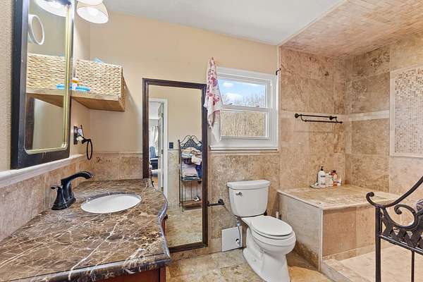 - Bathroom Mirror(s), Ceiling Fan(s), Coffered Ceiling(s), Primary Downstairs, Stone Counters, Walk-In Closet(s), Walk-In Shower