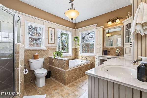 The primary suite is a retreat of its own, complete with tray ceiling, private fireplace, door access to the porch, jetted tub, large walk-in shower, double sinks, and an oversized walk-in closet. A Jack-and-Jill bath with double sinks and large shower serves additional bedrooms. The updated half bath and refreshed laundry room (with utility sink and storage closet) add even more functionality.