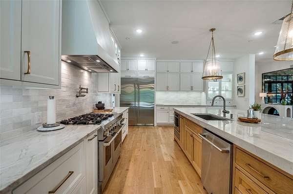 - Built-In Refrigerator, Cooktop, Dishwasher, Garbage Disposer, Gas Cooktop, Gas Range, Microwave, Range, Refrigerator, Warming Drawer, Washer